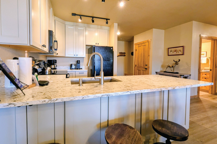 Inside, you’ll discover an inviting open living area with large windows framing lofty mountain views. The gas fireplace is perfect for warming up after fresh powder days or cool, starlit evenings. The décor strikes a balance — rustic mountain elegance meets modern touches — so whether you’re whipping up s’mores or gourmet dinner, it feels just right.