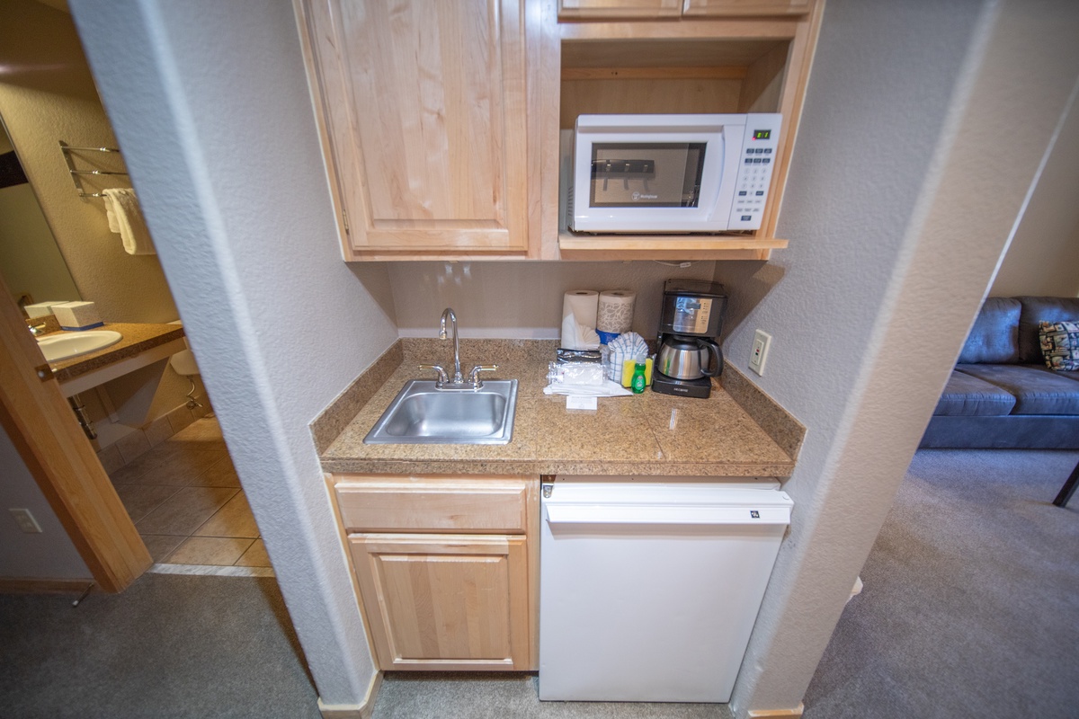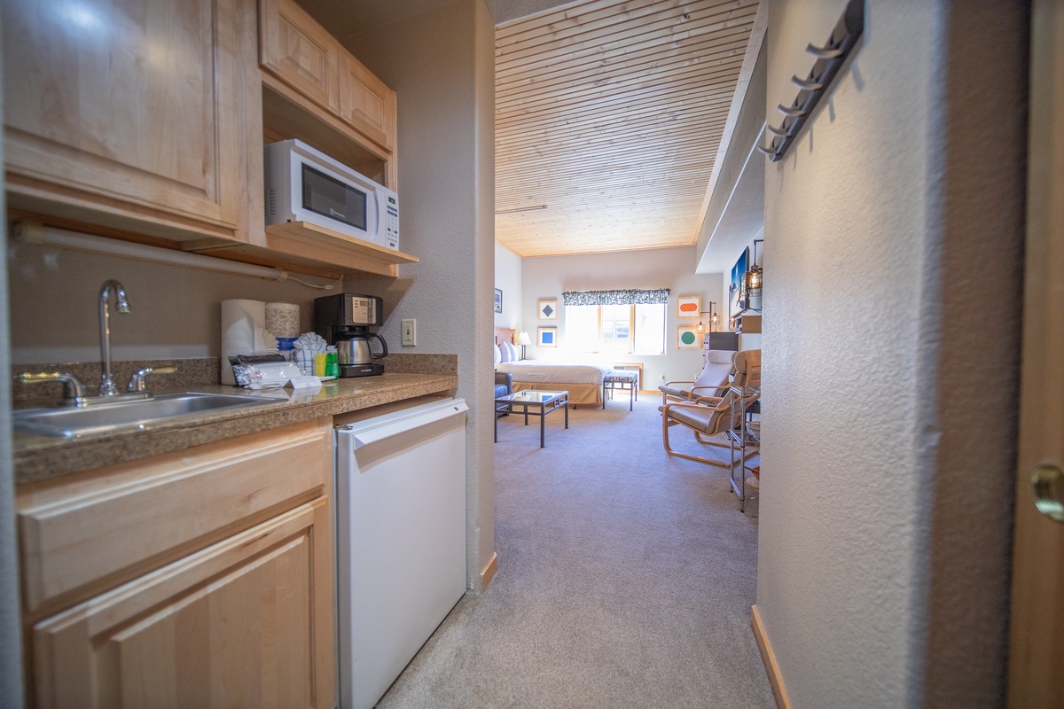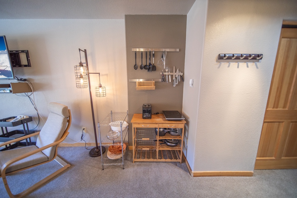 The kitchenette is equipped with a mini fridge, microwave, single induction cooktop, crock pot, and all the essentials needed to prepare simple meals. A high-top table with stools provides a comfortable spot to enjoy your meals.