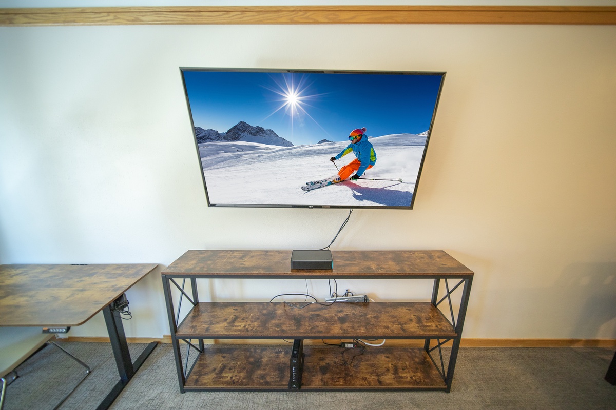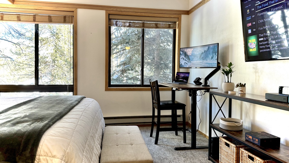 An adjustable workstation complete with a widescreen monitor provides a convenient space to catch up on work or take a conference call between skiing and play.