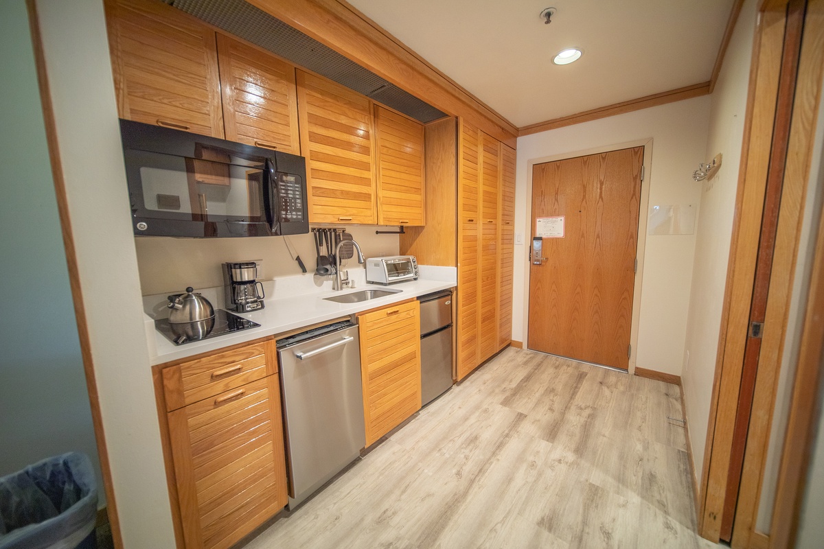 The fully equipped kitchenette features a stove top, dishwasher, mini fridge, and microwave, offering everything you need to prepare delicious meals with ease during your stay.