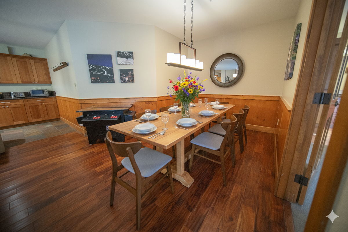 Step into the expansive living area, where alpine-inspired decor complements contemporary comfort. Relax by the cozy gas fireplace and feel the chill of the Rockies melt away as you unwind on plush furnishings. Oversized windows afford you stunning views of the surrounding mountainscape, imbuing a tranquil ambiance and an inherent connection with the outdoors.