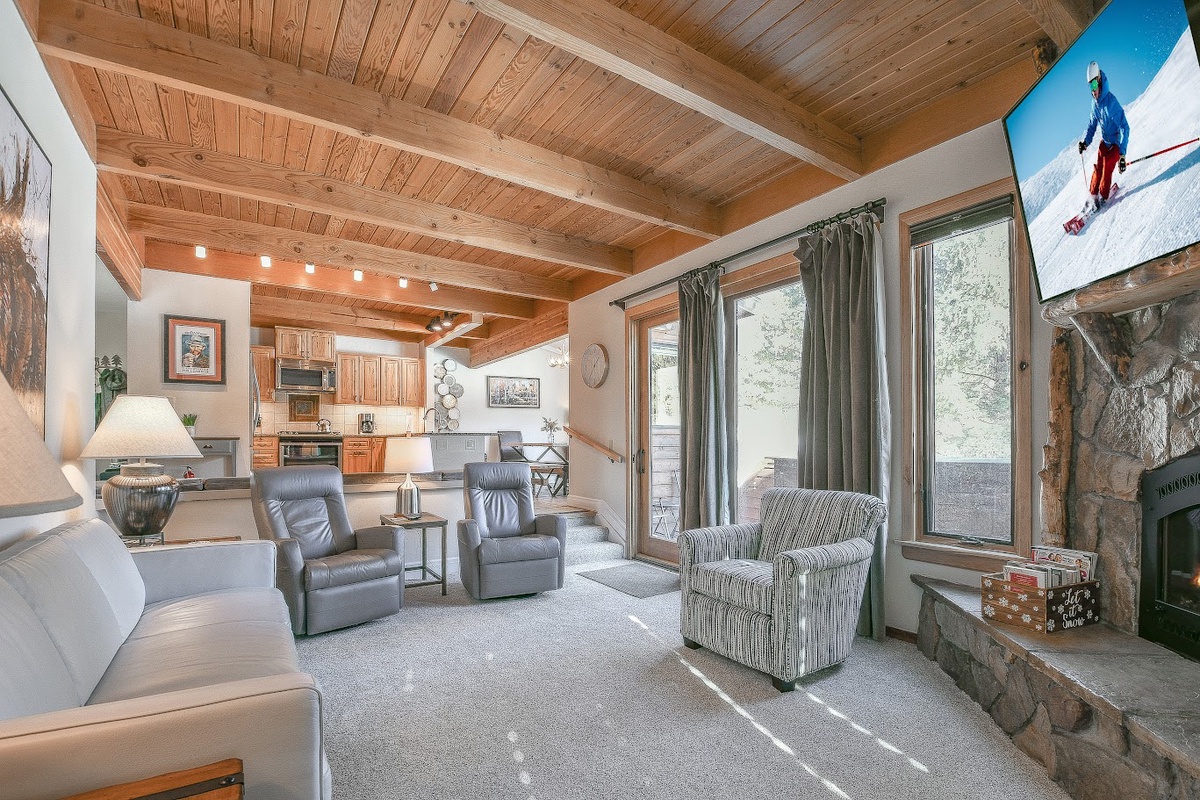 The open living area features large windows, a warm fireplace, and inviting mountain décor — the perfect setting to relax after a day of exploring. Comfortable seating and a flat-screen TV make it easy to unwind, whether it’s family movie night or a quiet evening with a glass of wine.