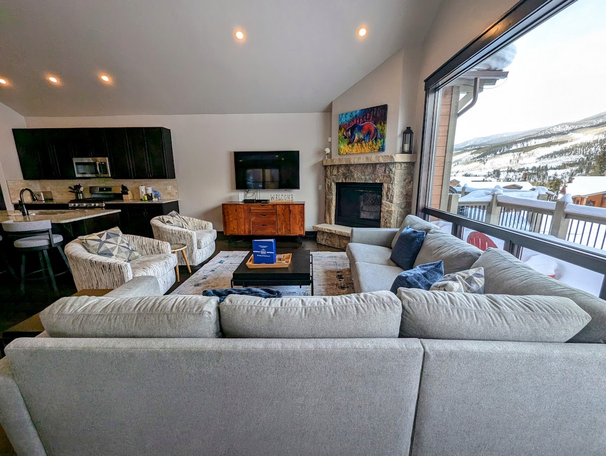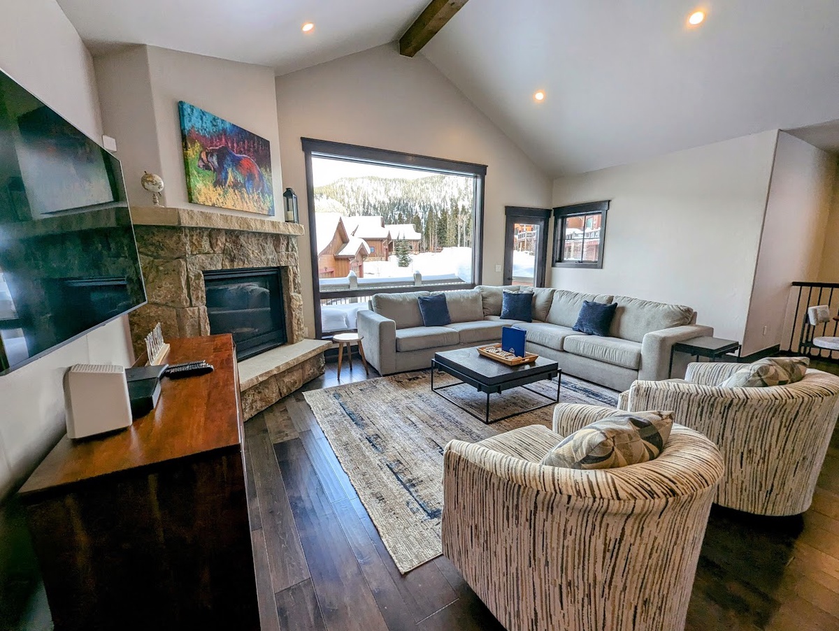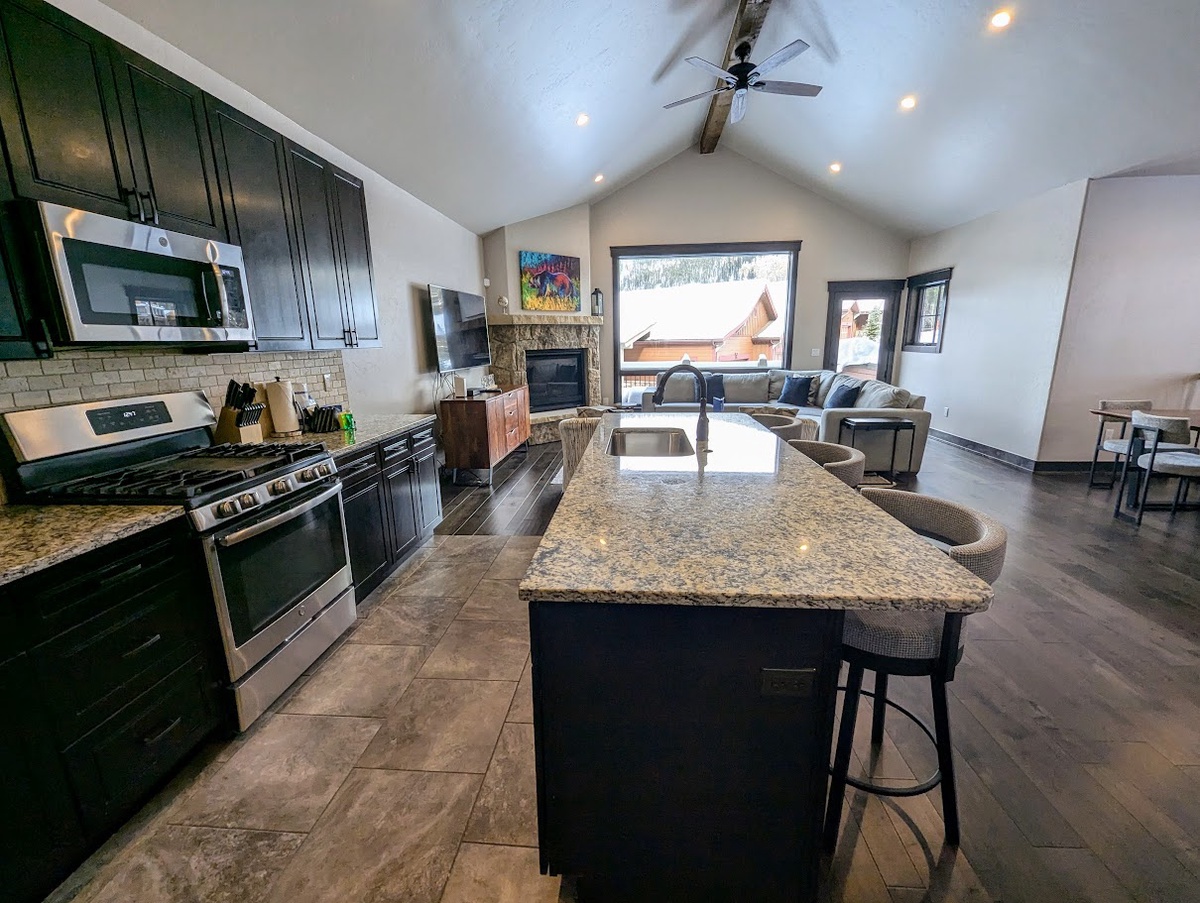 Step inside and be greeted by the warm and cozy atmosphere, stylish furnishings, and ample natural light that floods through the many large windows. The living room features plush sofas and chairs, perfect for snuggling up after a long day on the slopes. The modern gas fireplace provides the perfect ambiance for a romantic night in or a family game night. The open-concept kitchen boasts stainless steel appliances, granite countertops, and plenty of space for meal prep and cooking. The large dining table offers plenty of seating, perfect for your family dinners and breaking out the games in the evening.