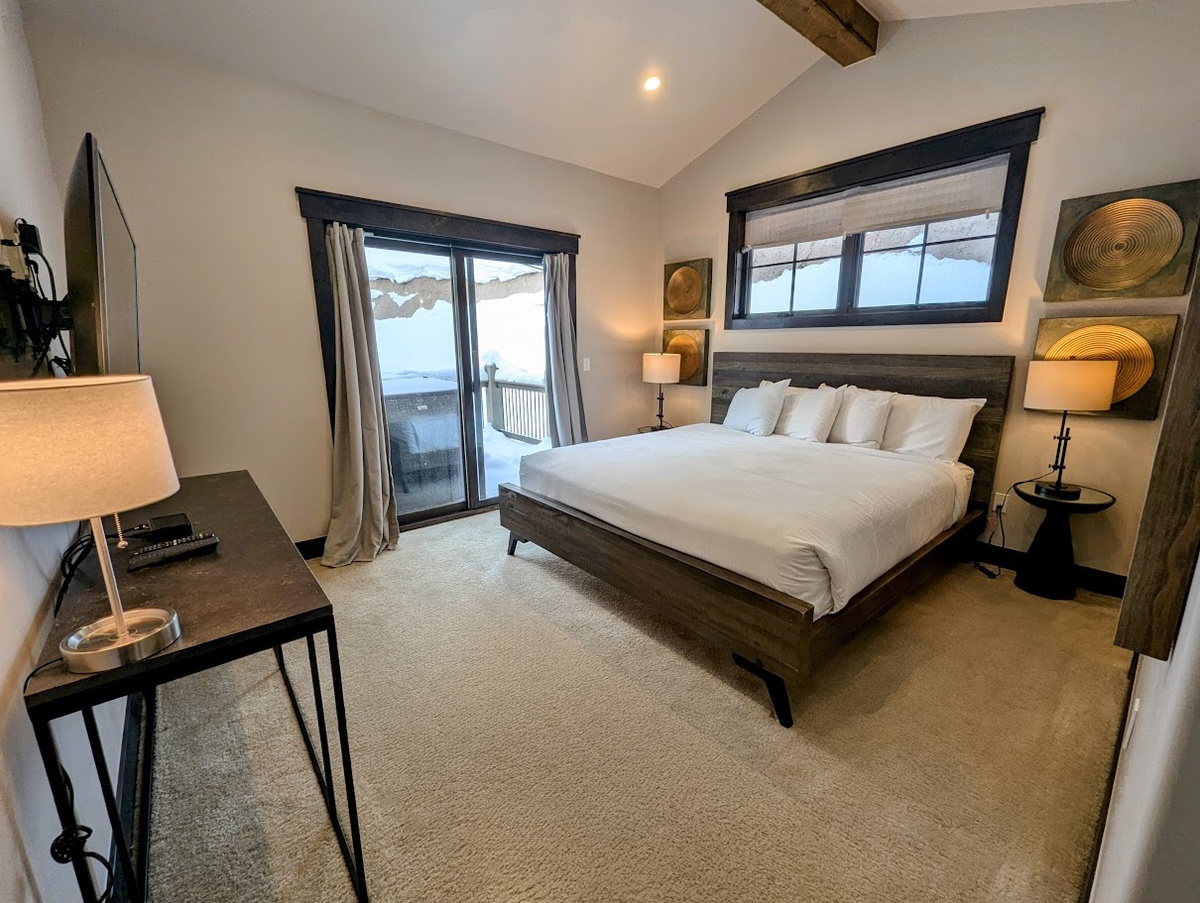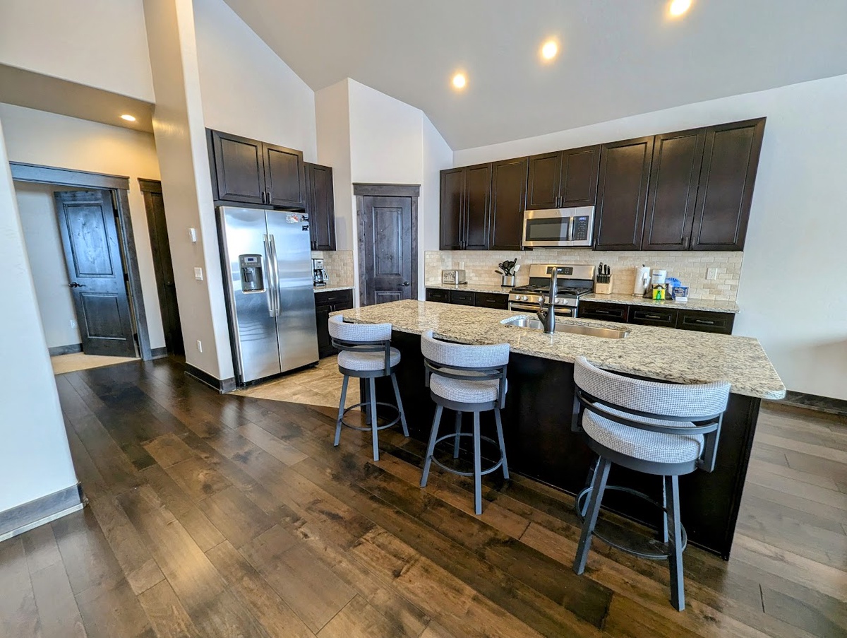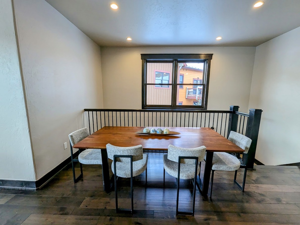 Step inside and be greeted by the warm and cozy atmosphere, stylish furnishings, and ample natural light that floods through the many large windows. The living room features plush sofas and chairs, perfect for snuggling up after a long day on the slopes. The modern gas fireplace provides the perfect ambiance for a romantic night in or a family game night. The open-concept kitchen boasts stainless steel appliances, granite countertops, and plenty of space for meal prep and cooking. The large dining table offers plenty of seating, perfect for your family dinners and breaking out the games in the evening.