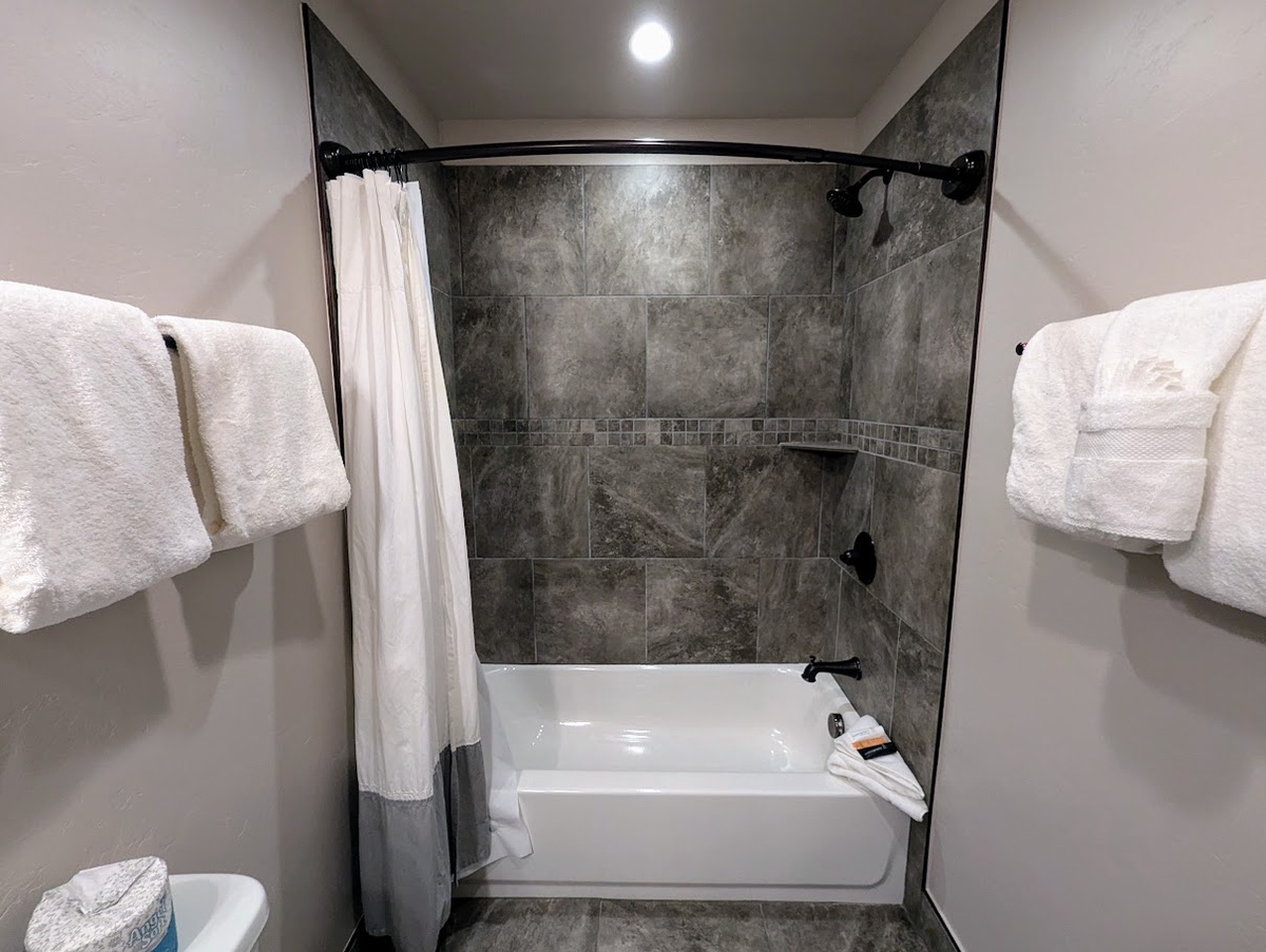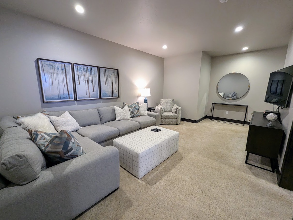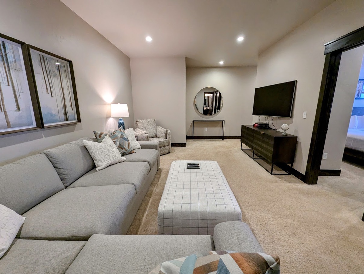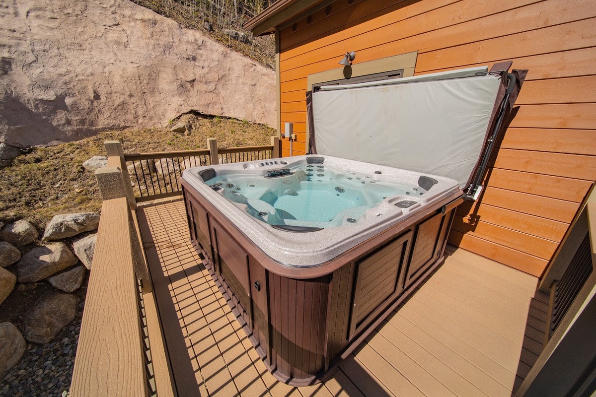 The large master bedroom has an en suite bathroom, tasteful furnishings, and a spa-like shower! The other bedrooms have a variety of bed sizes and will be a good fit for groups with different sleeping requirements. There is a lower-level den that has a comfortable sofa and a flat-screen TV for anyone wanting a quiet retreat. Stepping out onto the private balcony for a soak in the private hot tub under the stars is a wonderful way to enjoy your evenings.