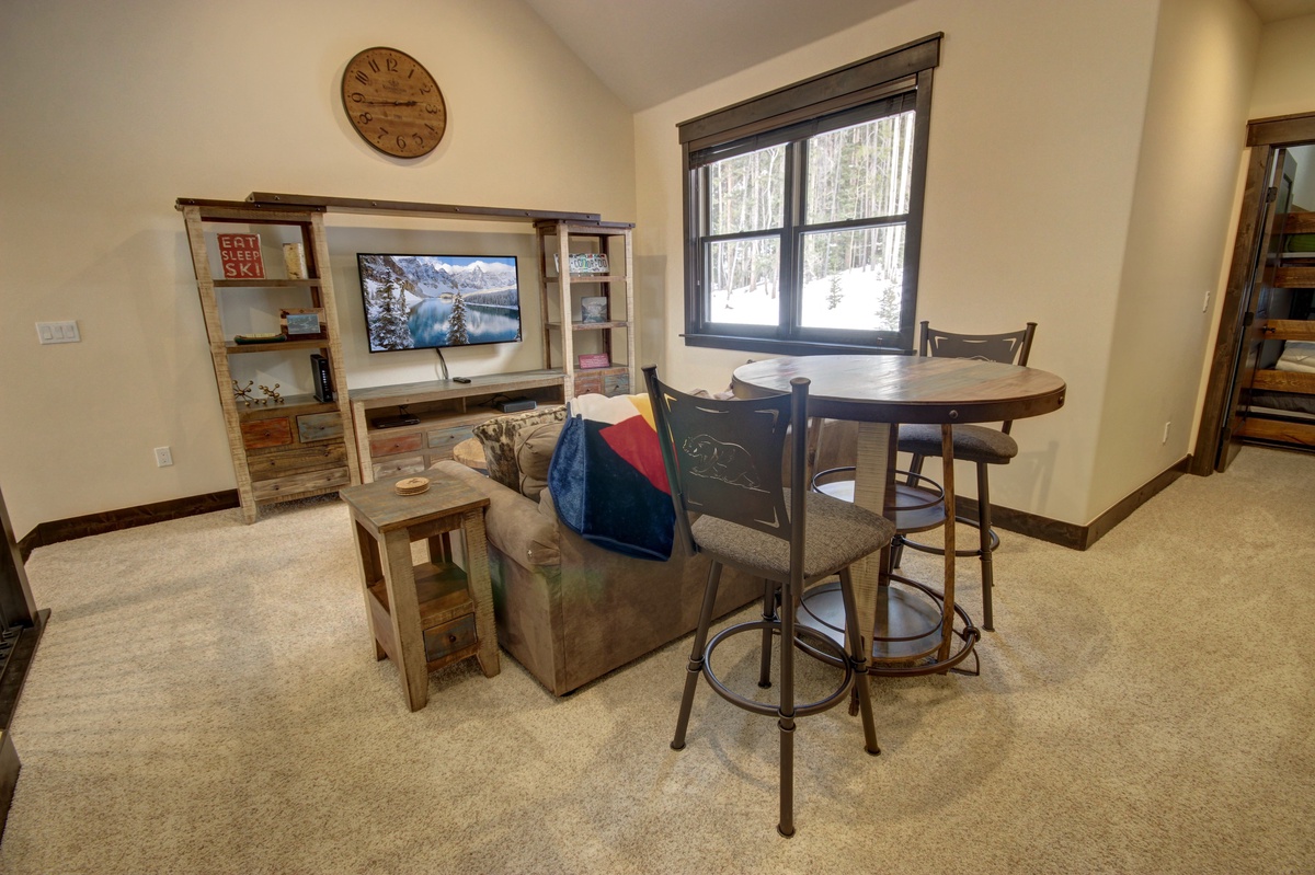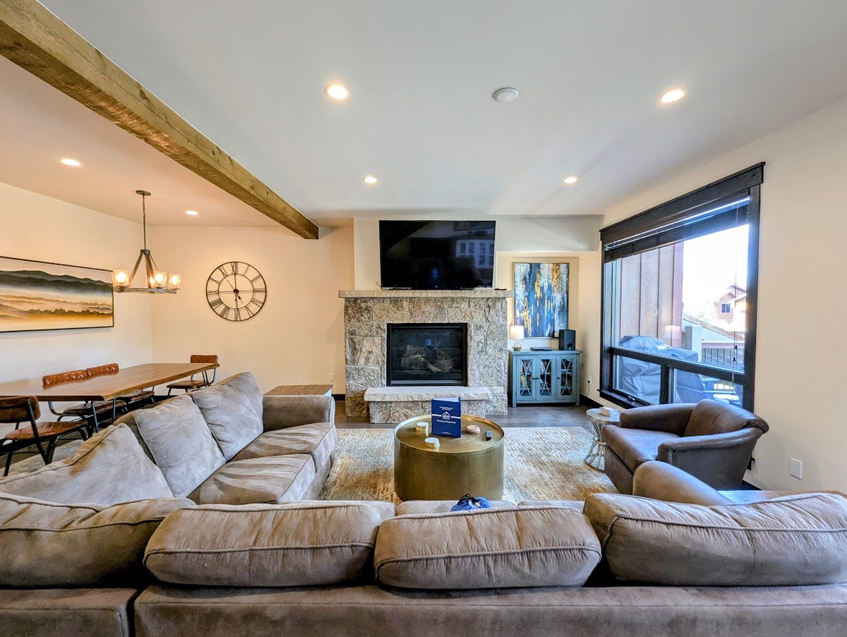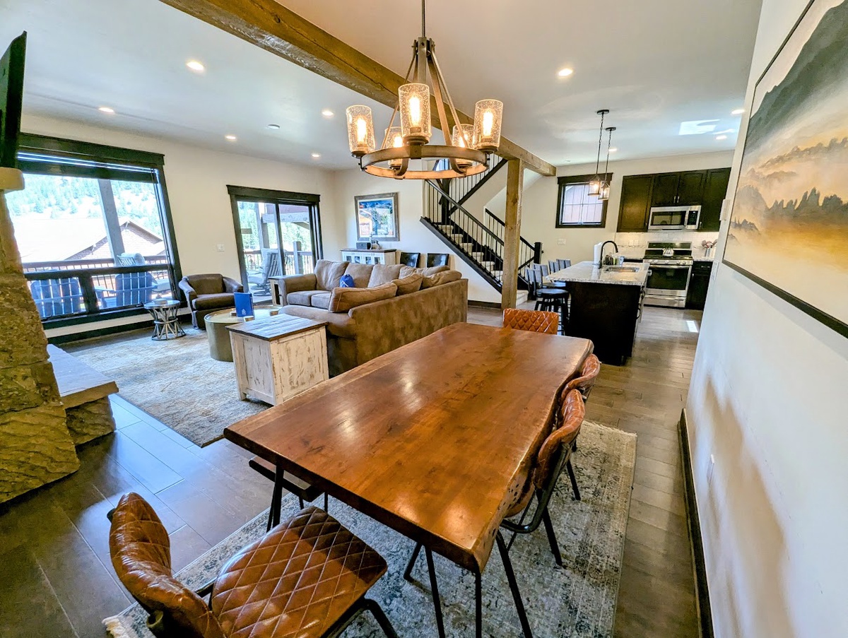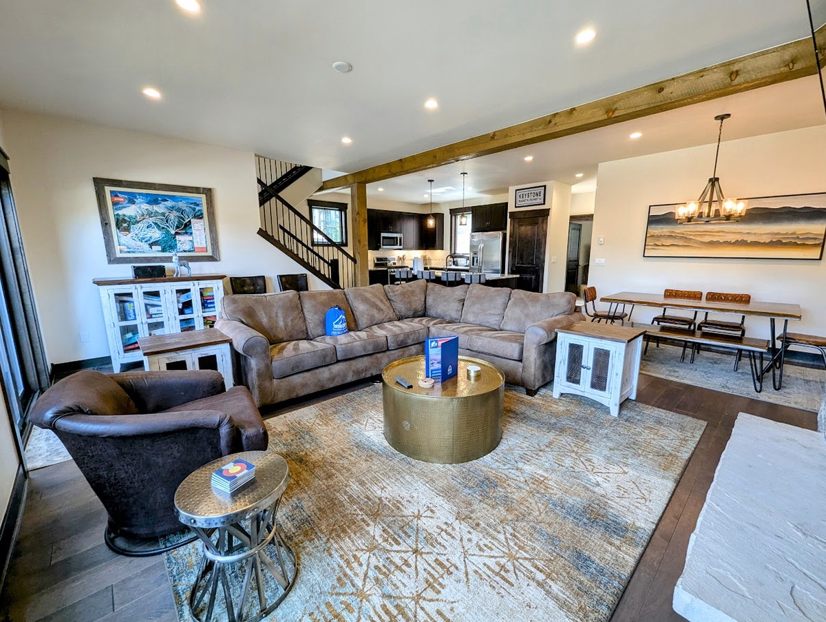 As you step into the main living area upstairs, you're greeted by a cozy living area that is both elegant and comfortable. The furnishings are stylish and modern, with a plush sofa and an armchair arranged around a warming fireplace and a large TV - it's the perfect space to unwind and relax after a long day on the slopes. Natural light floods the room, making it cheerful and inviting. You can enjoy the unparalleled view of Keystone’s nature from the balcony while sipping on hot cocoa.