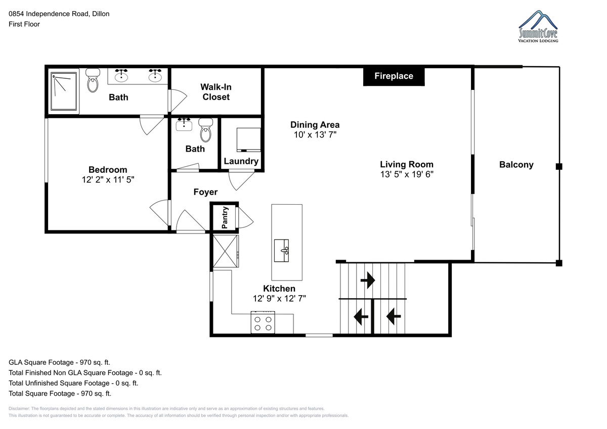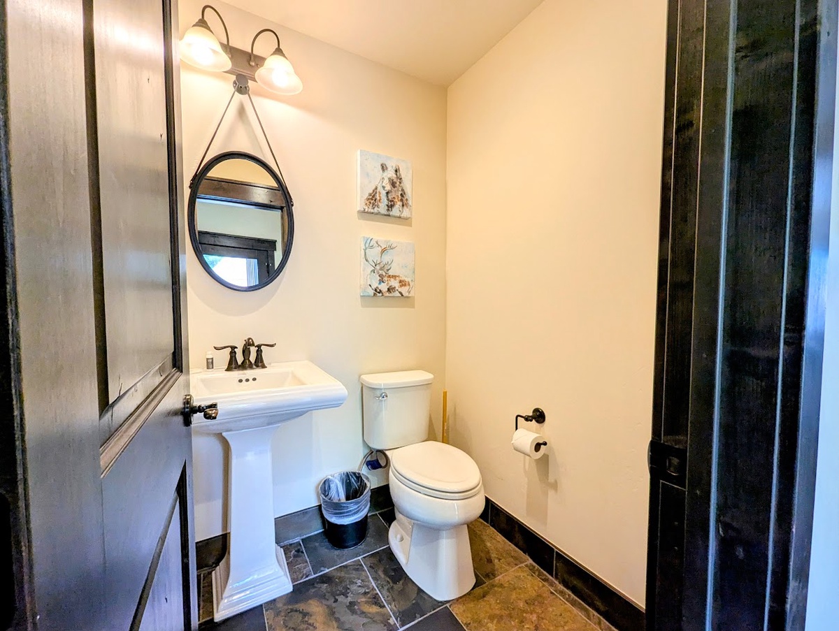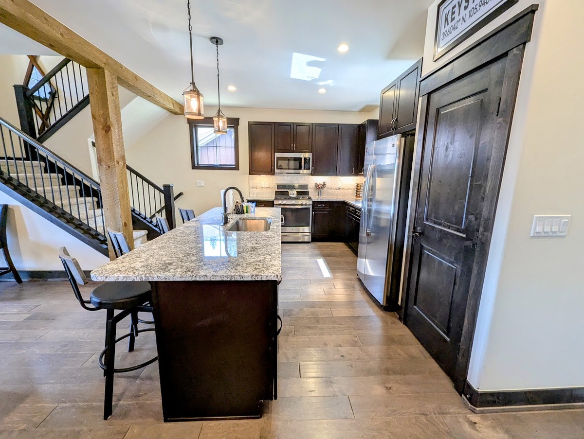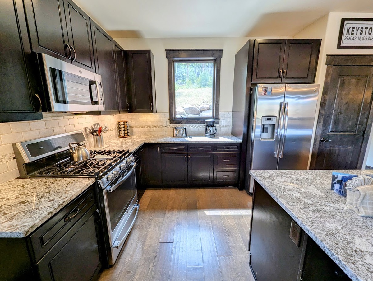 As you step into the main living area upstairs, you're greeted by a cozy living area that is both elegant and comfortable. The furnishings are stylish and modern, with a plush sofa and an armchair arranged around a warming fireplace and a large TV - it's the perfect space to unwind and relax after a long day on the slopes. Natural light floods the room, making it cheerful and inviting. You can enjoy the unparalleled view of Keystone’s nature from the balcony while sipping on hot cocoa.