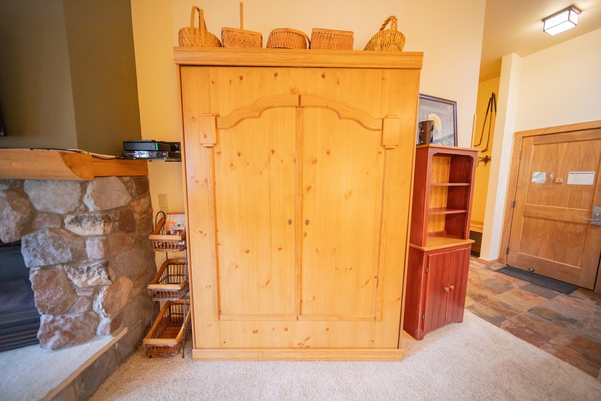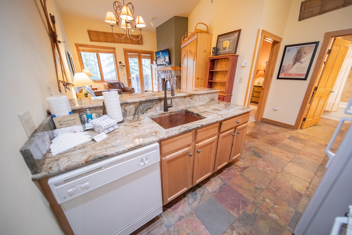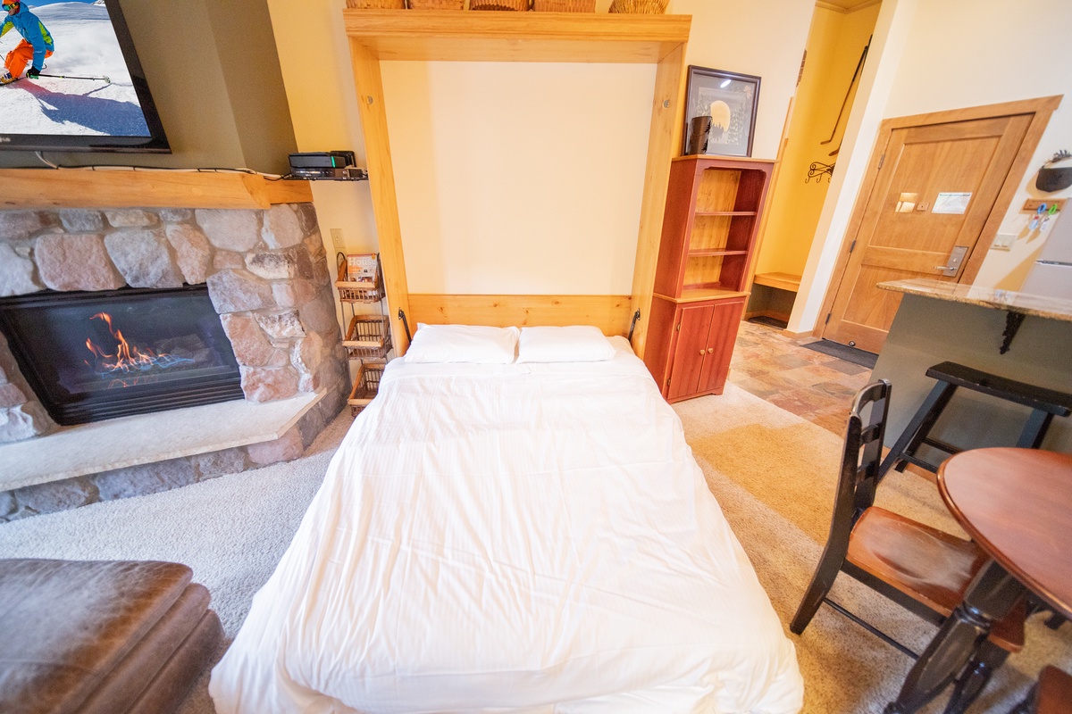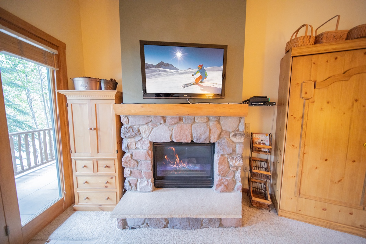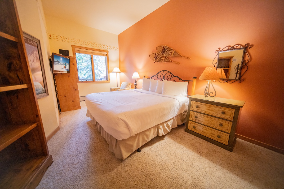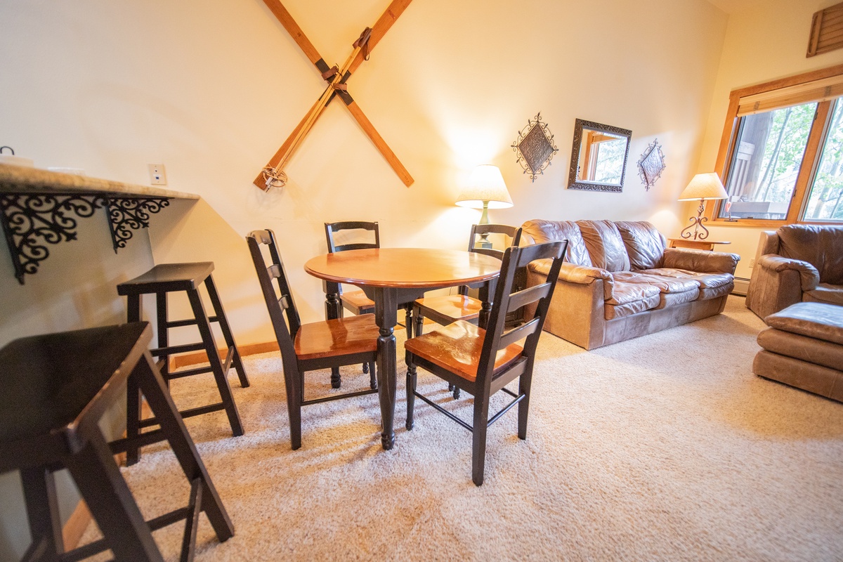 The living room features a comfortable seating arrangement, flat-screen TV, and an inviting gas fireplace perfect for warming up after a long day on the slopes. The kitchen is fully equipped with everything you need to prepare delicious meals during your stay. The dining area is perfect for enjoying a meal with family or friends while soaking up the beautiful view. The bedroom is spacious and inviting and will be the perfect spot for you to relax and rejuvenate overnight as you prepare for a day in the Colorado outdoors.