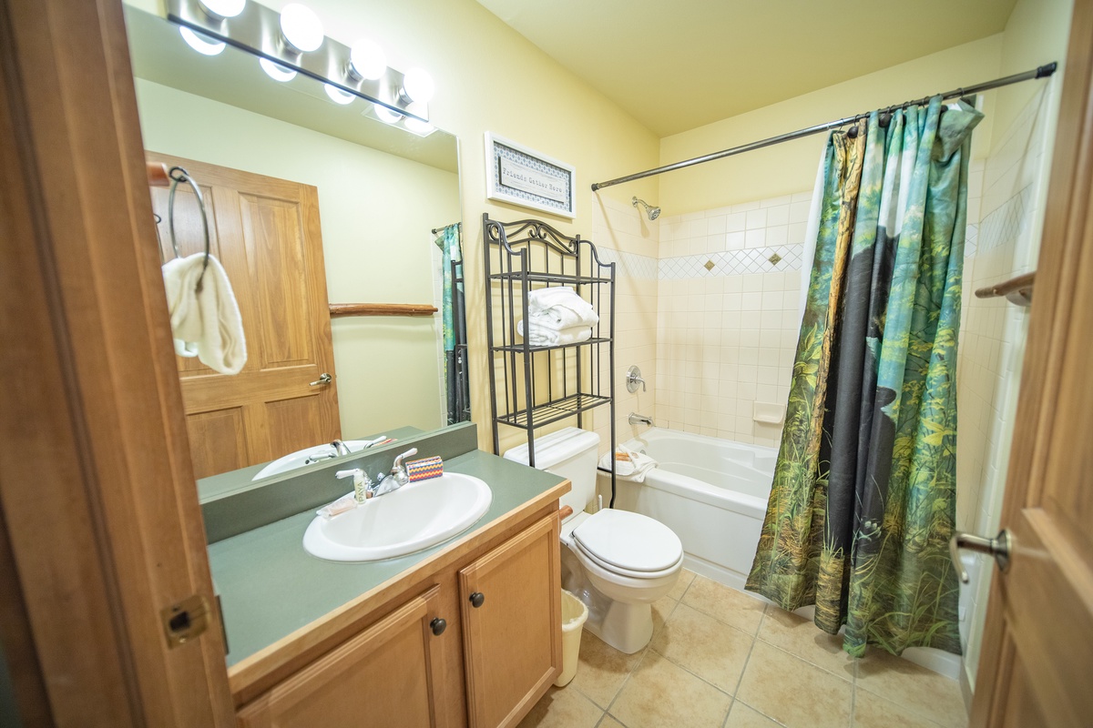 The bedroom is spacious and comfortable with plenty of room for guests to store their belongings. The bathroom is large and well-appointed, featuring all the necessary amenities such as towels, a hairdryer, and ample space to store your toiletries.