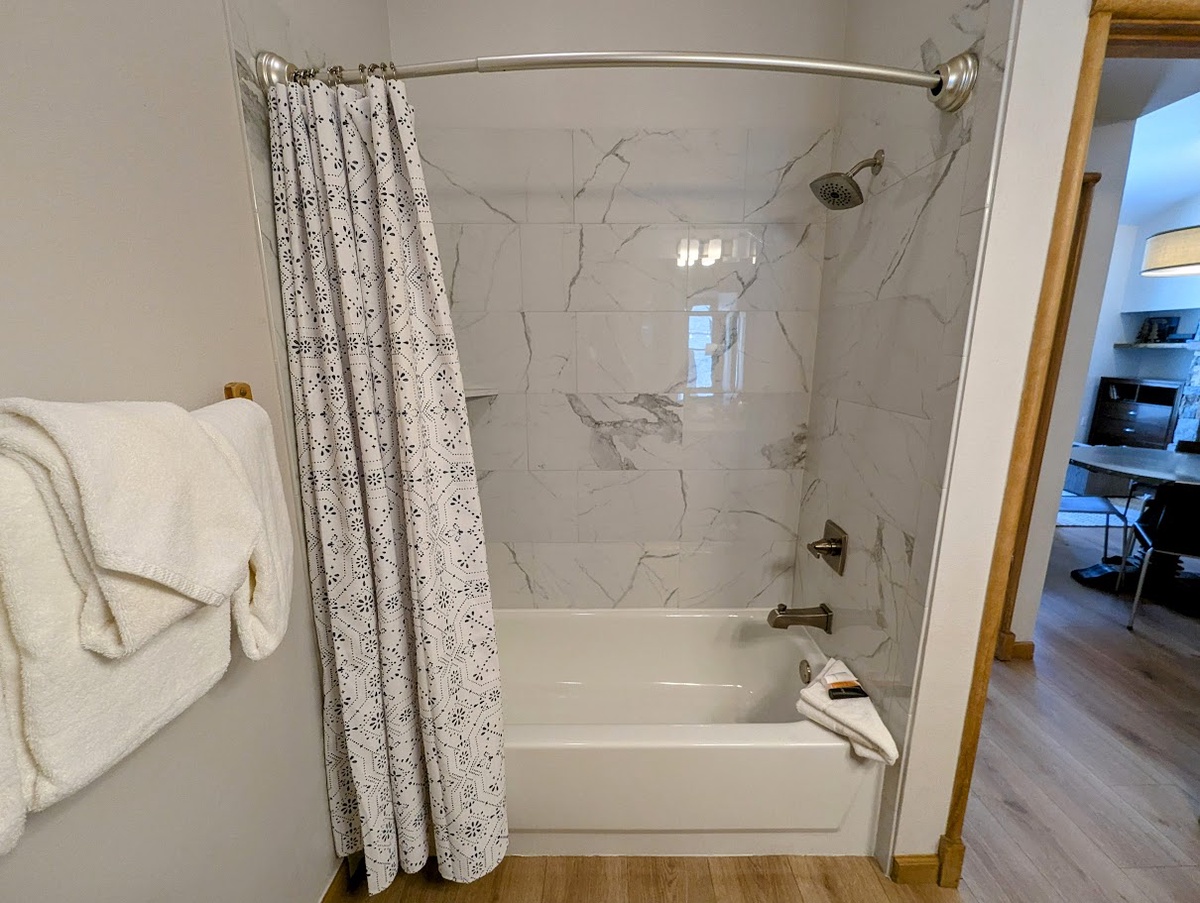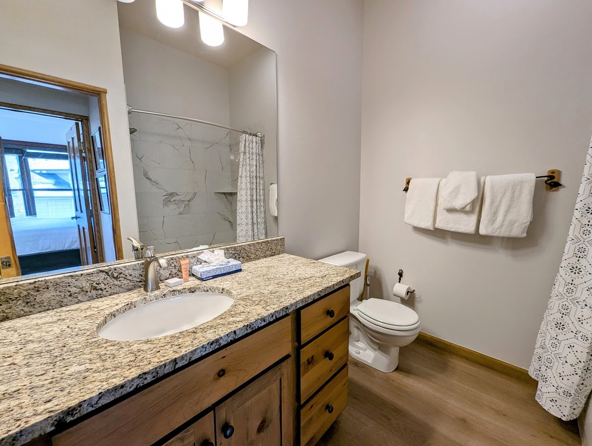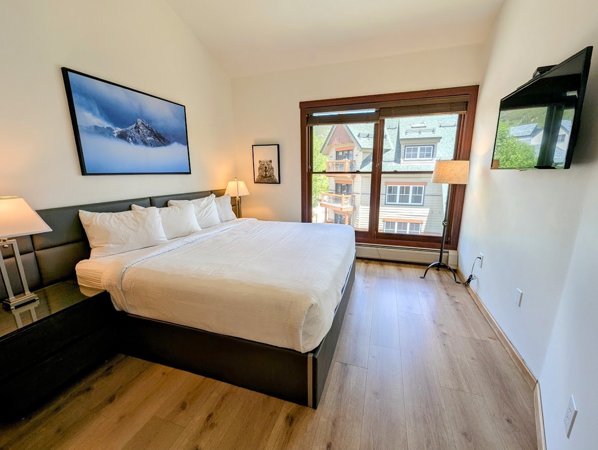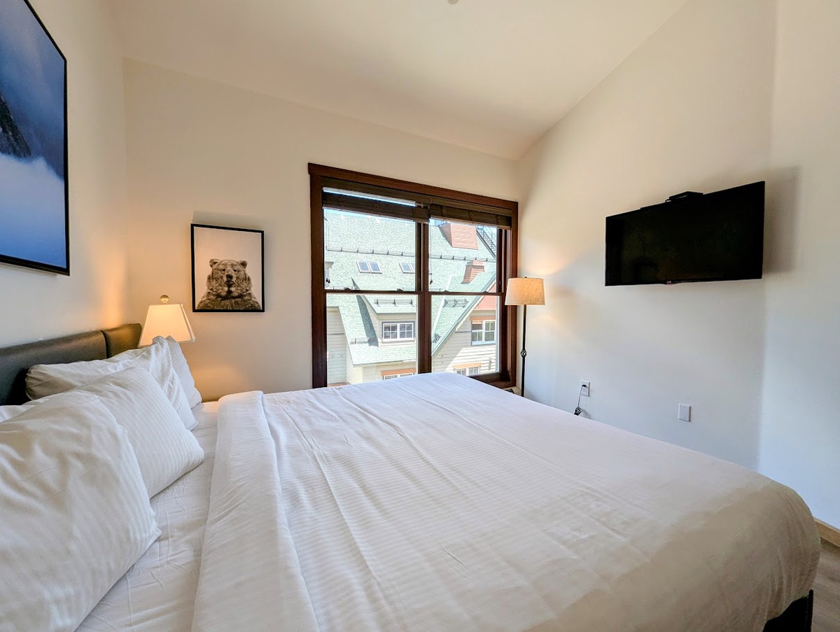 After an exhilarating day on the slopes, unwind in the comfortable bedroom, offering a peaceful sanctuary for a restful night's sleep. The contemporary bathroom features a shower/tub combo, ensuring you can refresh and rejuvenate after your mountain adventures. Additionally, the resort-style amenities in Black Bear Lodge will truly enhance your vacation experience. Soothe your muscles in the outdoor hot tub, sweat it out in the fitness center, or gather around the fire pit to share stories with fellow travelers.