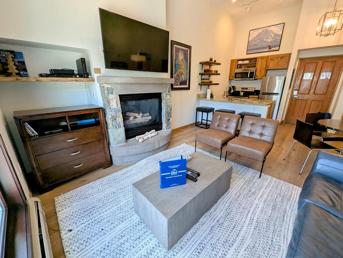 Step inside and be greeted by a warm and inviting living area, designed with your comfort in mind. Sink into the cozy couch and feel the stress melt away as you take in the rustic mountain decor and the soft glow of the fireplace. The open-concept layout seamlessly leads you into a fully-equipped kitchen, complete with modern appliances and ample counter space, making meal preparation a breeze.