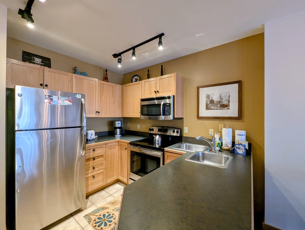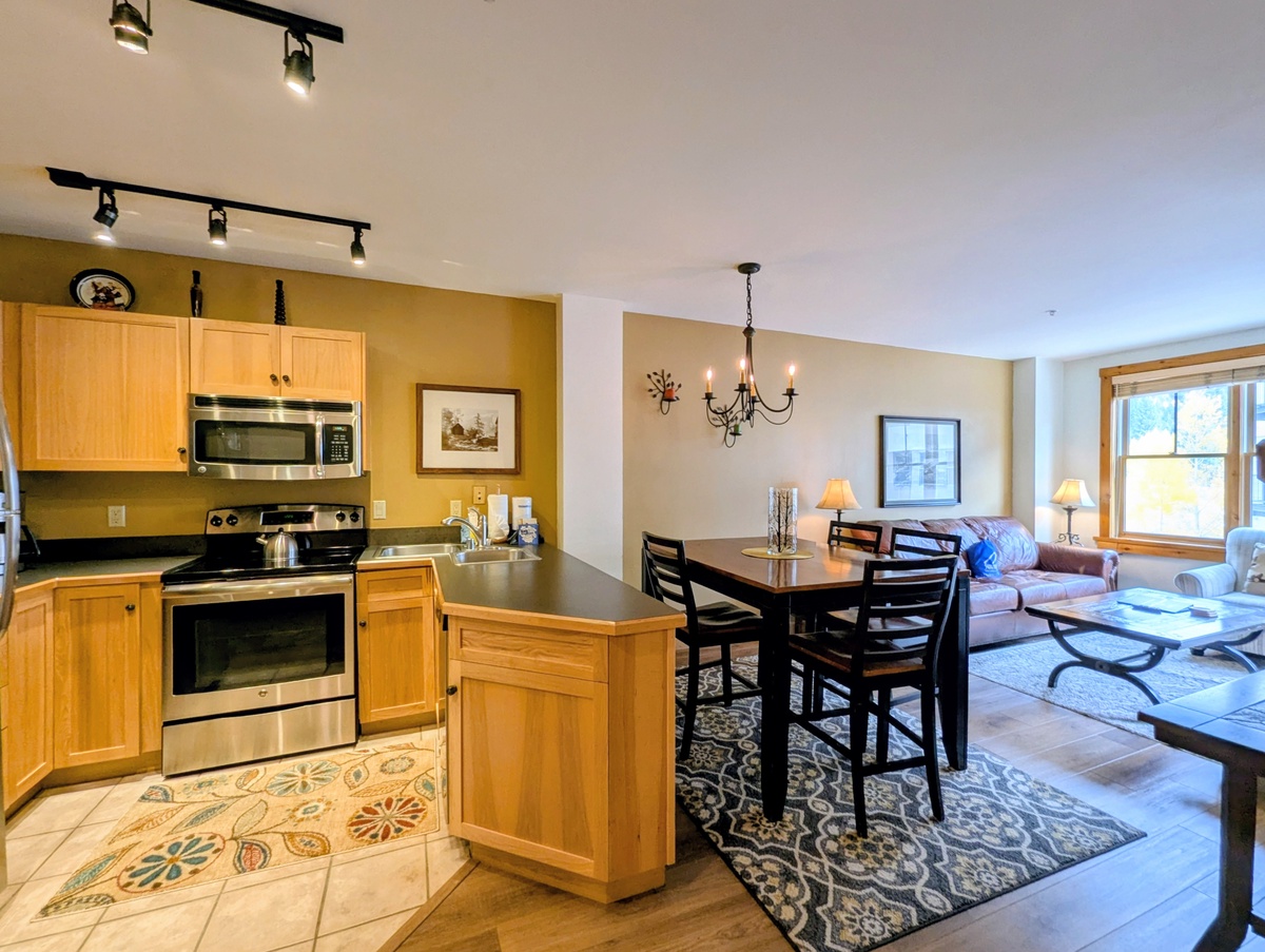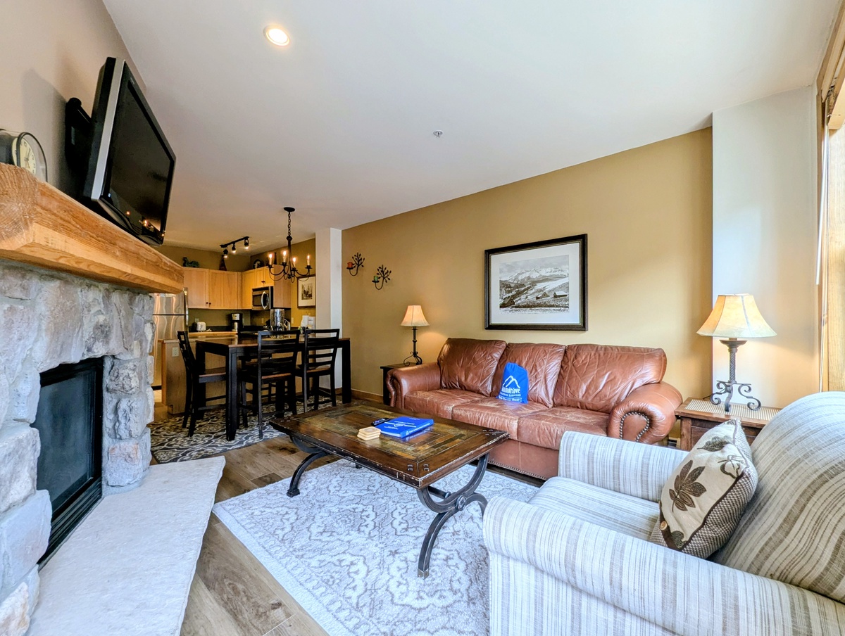 Step inside this beautifully decorated condo, and you'll instantly feel at ease. The open concept living area is bright and spacious, providing plenty of room to relax after a day on the slopes. The comfortable furnishings invite you to sink in and unwind, while the stone fireplace adds a cozy ambiance to the space. Enjoy a movie night with the large flat-screen TV, or simply gaze out of the window at the stunning mountain views.