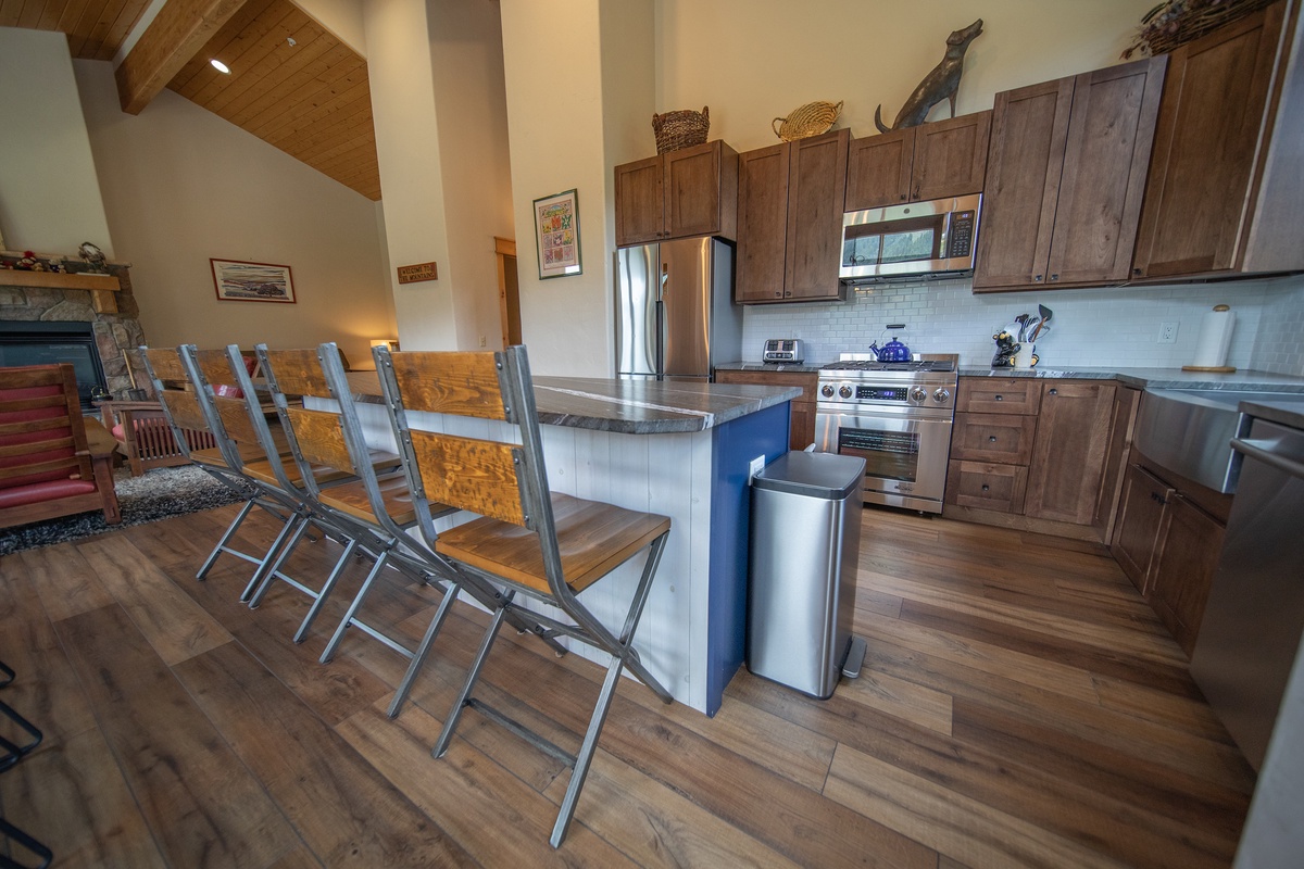 The fully equipped, modern kitchen boasts stainless steel appliances, granite countertops, and invites you to cook up delicious meals while enjoying the company of loved ones.