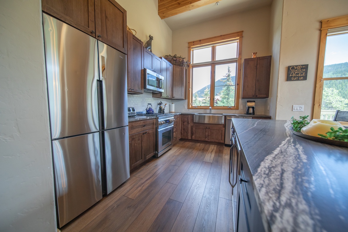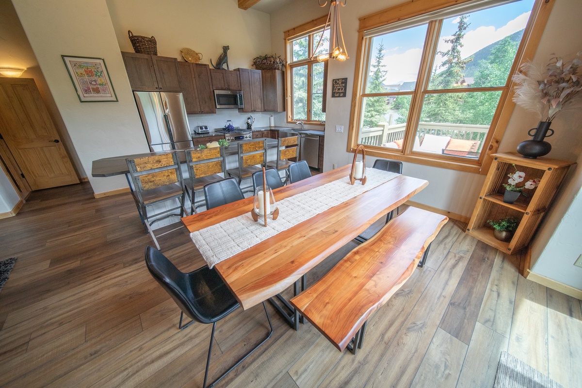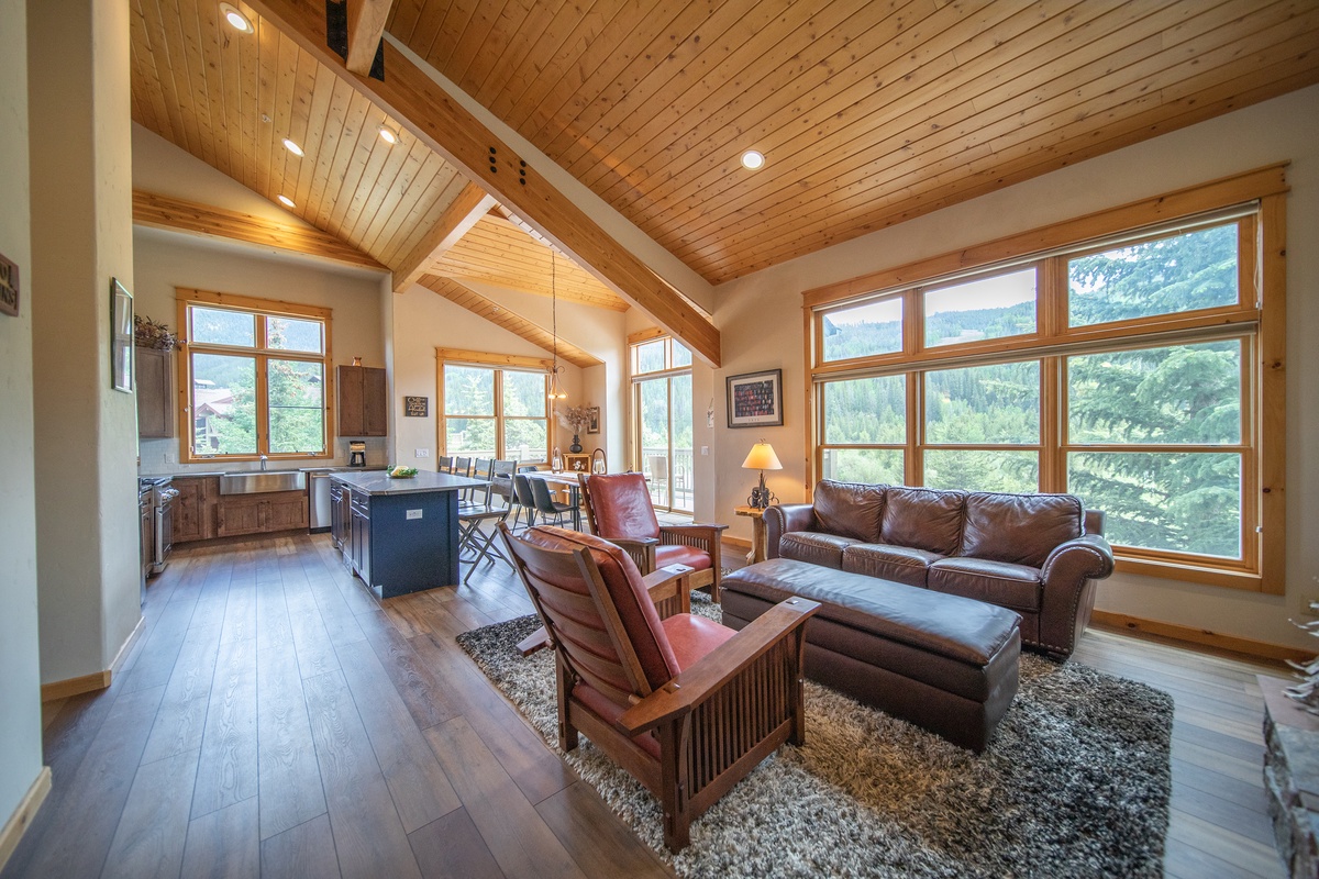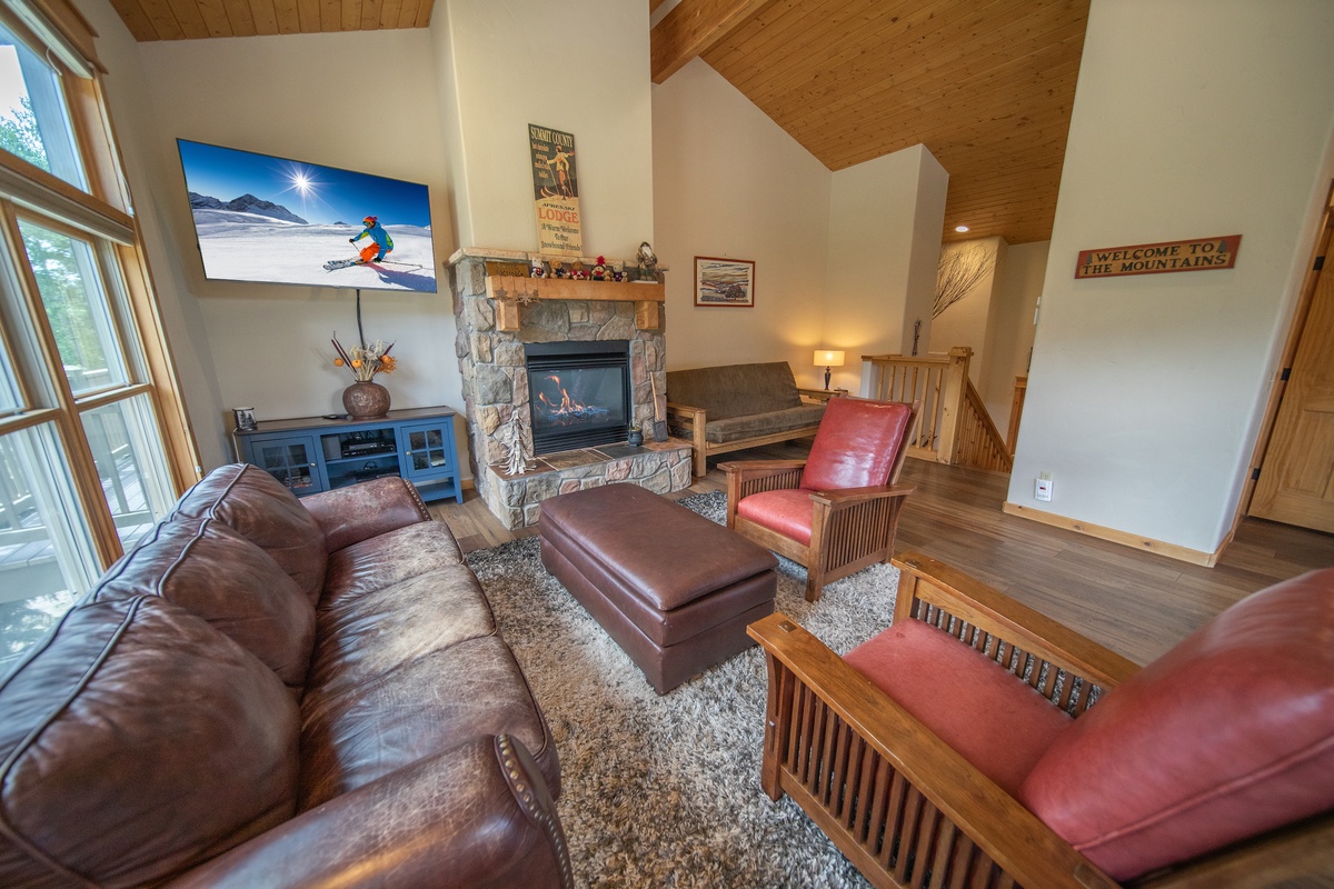 Step into the open-concept living area and enjoy the abundance of natural light streaming through large windows, highlighting stunning views of the mountains. Vaulted ceilings add to the airy feel, welcoming in Colorado's sunshine. Gather around the beautiful stone fireplace on cool evenings and share stories of the day's adventures. The expansive private deck provides panoramic views of the ski mountain and surrounding forest.