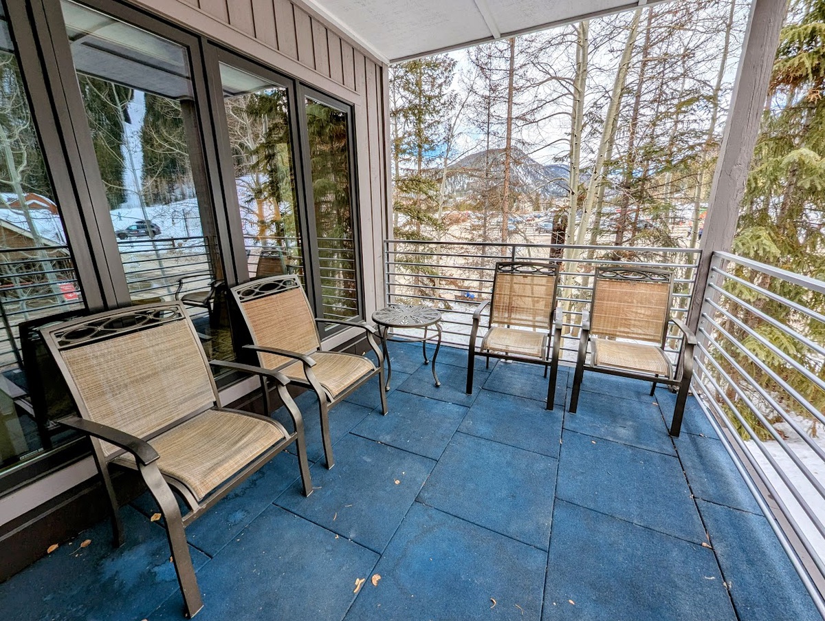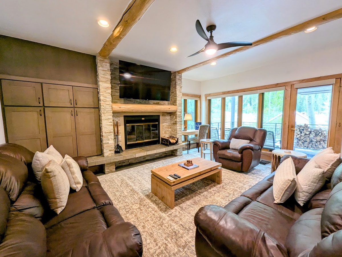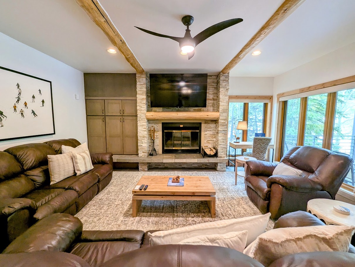 This West facing vacation property welcomes in the Colorado sunshine all day long! The bright, beautifully designed interior enhances the open-concept living space that exudes comfort and style. The living room features a wood burning fireplace, perfect for warming up after a day of exploring, and plush seating where you can gather with loved ones. Large windows frame picturesque mountain views, filling the space with natural light and creating an inviting atmosphere. Step outside onto the private patio and take in the fresh mountain air while sipping a hot cup of coffee or enjoying an apres beverage.