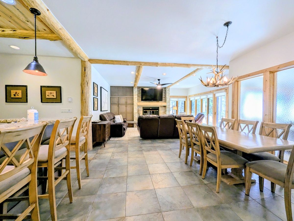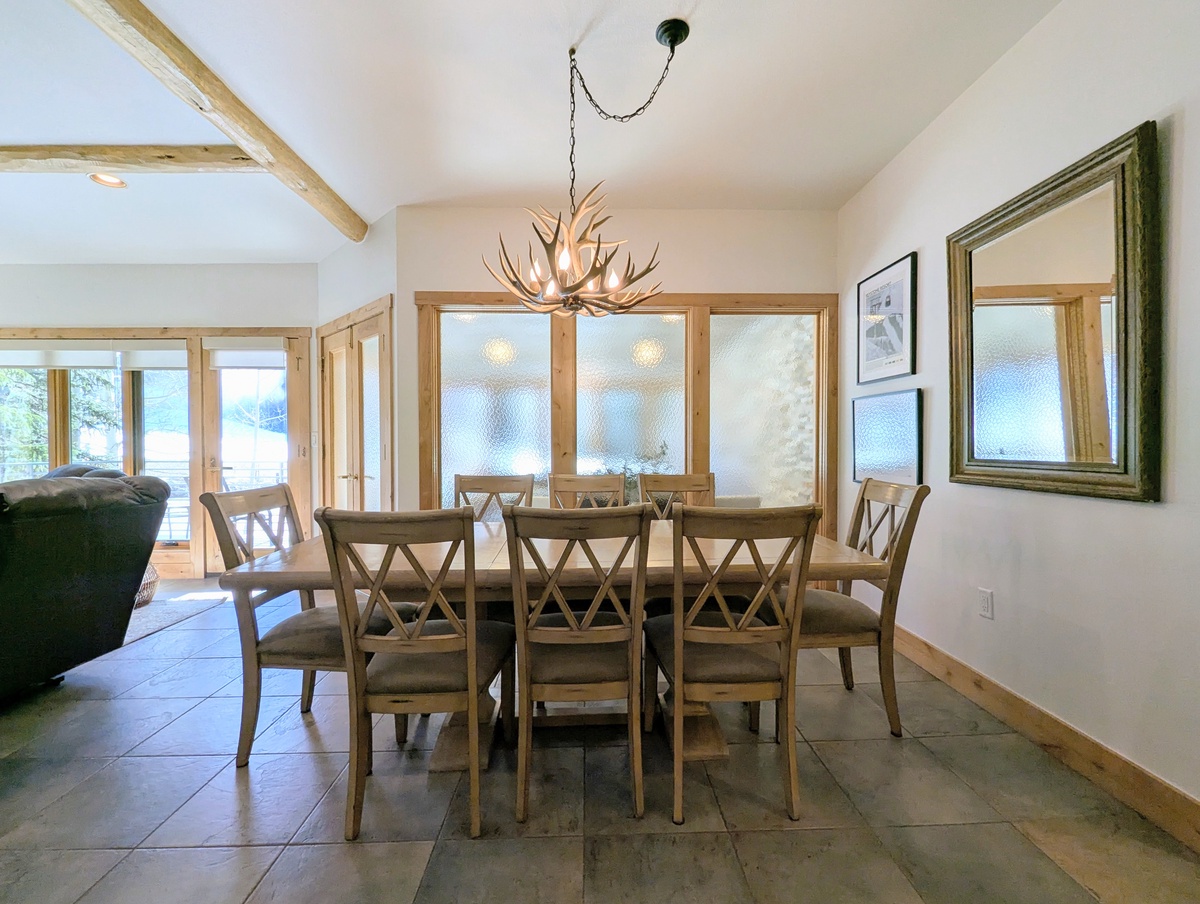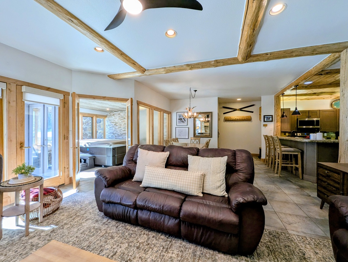 This West facing vacation property welcomes in the Colorado sunshine all day long! The bright, beautifully designed interior enhances the open-concept living space that exudes comfort and style. The living room features a wood burning fireplace, perfect for warming up after a day of exploring, and plush seating where you can gather with loved ones. Large windows frame picturesque mountain views, filling the space with natural light and creating an inviting atmosphere. Step outside onto the private patio and take in the fresh mountain air while sipping a hot cup of coffee or enjoying an apres beverage.