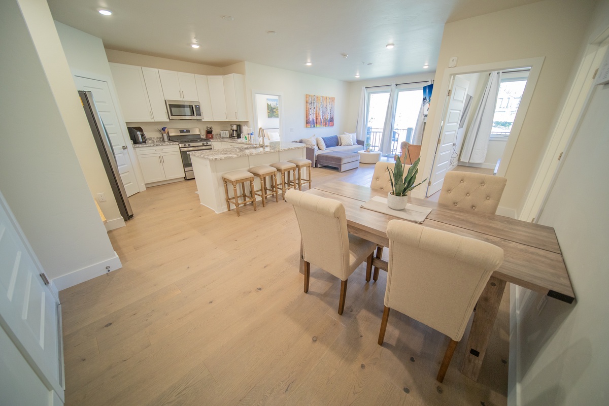As you walk into the condo, you'll feel right at home with the warm and inviting atmosphere that greets you. The living room boasts a comfortable seating area, perfect for enjoying time with family and friends or for simply relaxing after a long day. The dining area and fully-equipped kitchen are seamlessly integrated into the living room, allowing for a spacious and open feeling.
