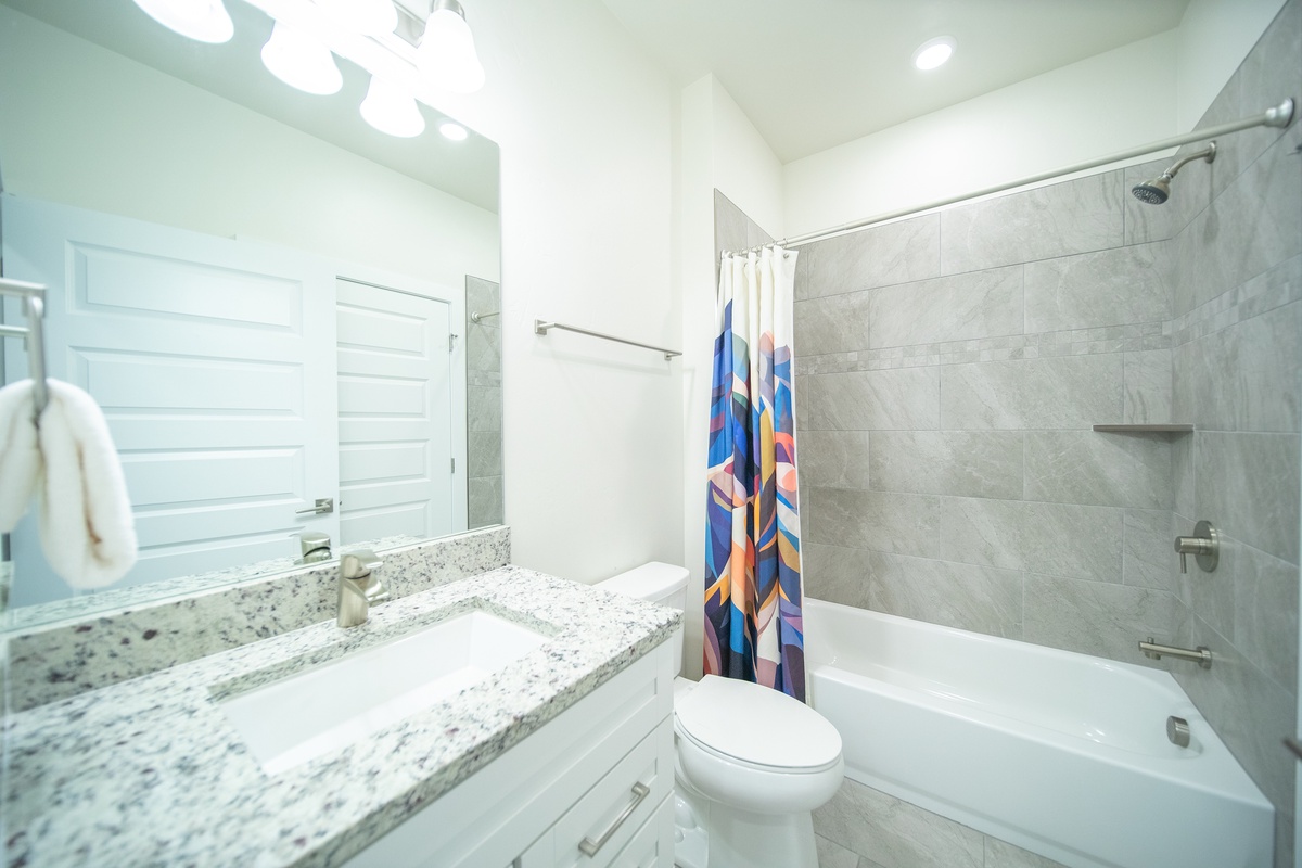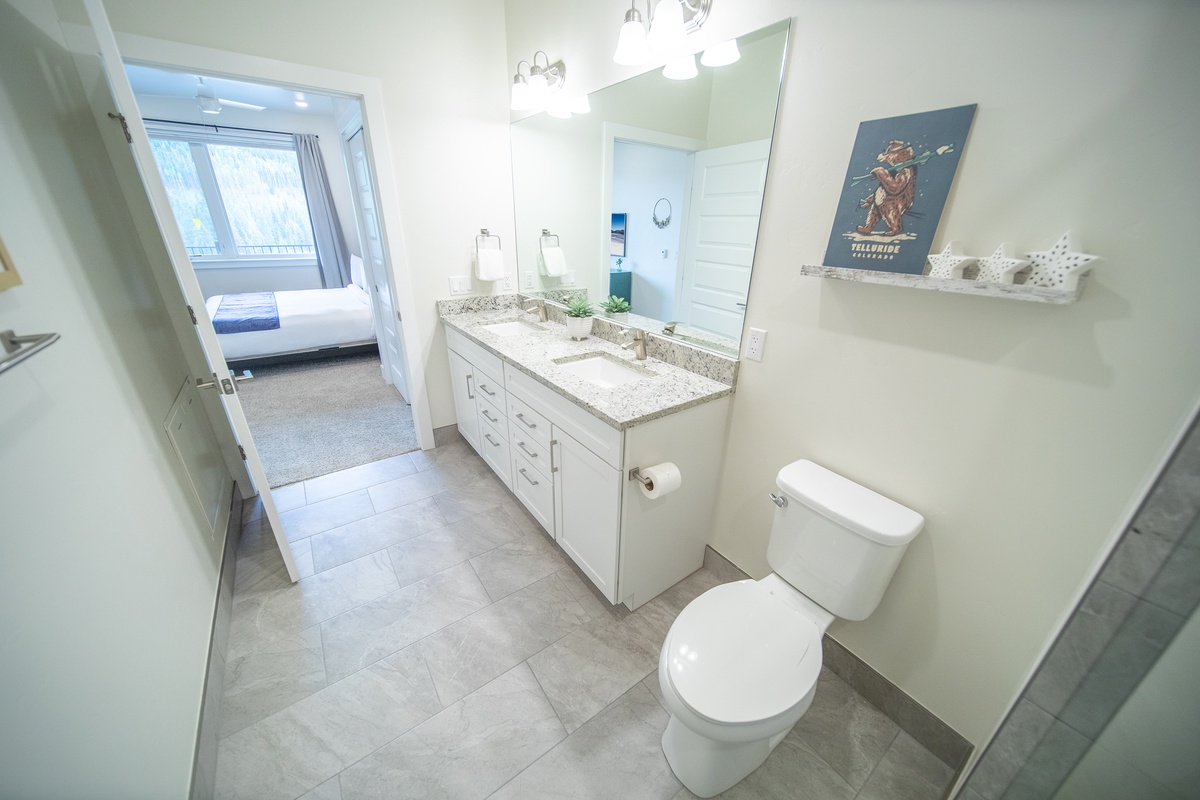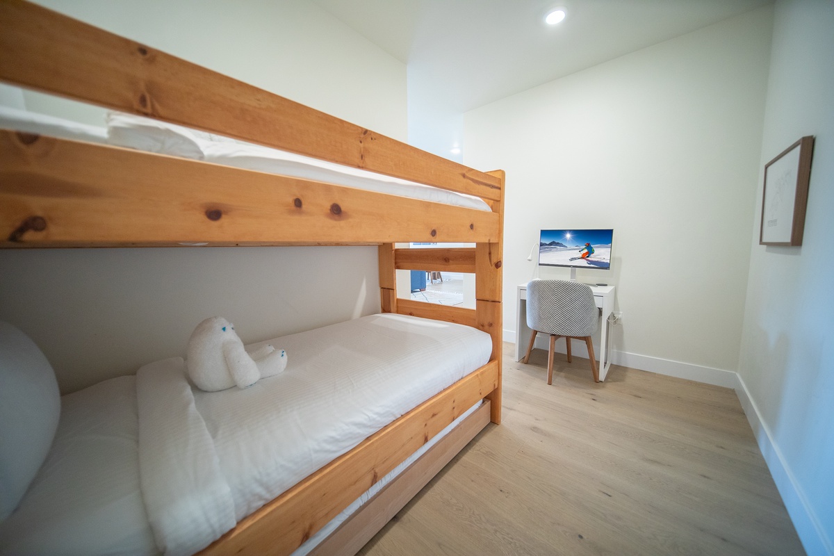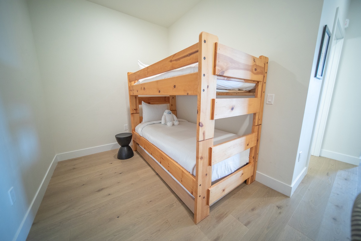 The two bedrooms are thoughtfully furnished havens for rest, each offering cozy beds, ample storage, and serene decor. Wake up refreshed and enjoy peaceful mountain views from your window. The bonus room provides additional sleeping space with bunk beds, along with a desk and computer setup. The two bathrooms are elegantly appointed with modern fixtures and ample space to meet your needs, ensuring a comfortable stay for all guests.