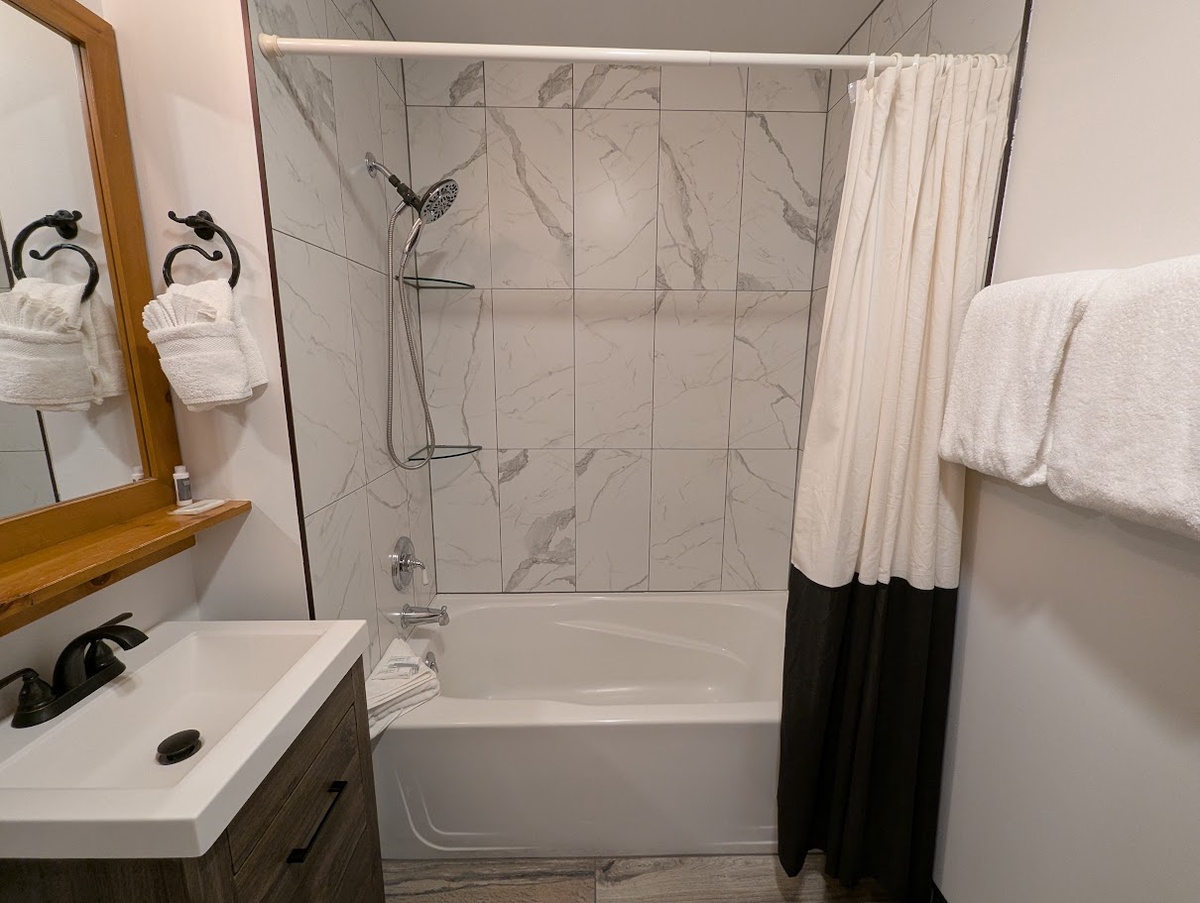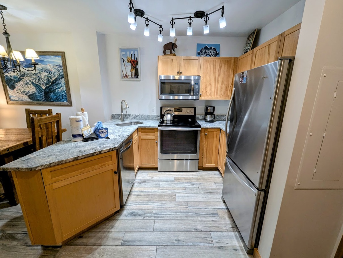 The fully equipped kitchen boasts modern appliances and ample counter space, inviting you to prepare delicious meals or quick snacks. Enjoy your meals at the dining area, perfect for a home-cooked dinner or a friendly card game. The bedroom provides a peaceful retreat after a day on the slopes, while the well-appointed bathroom ensures your comfort and convenience throughout your stay.