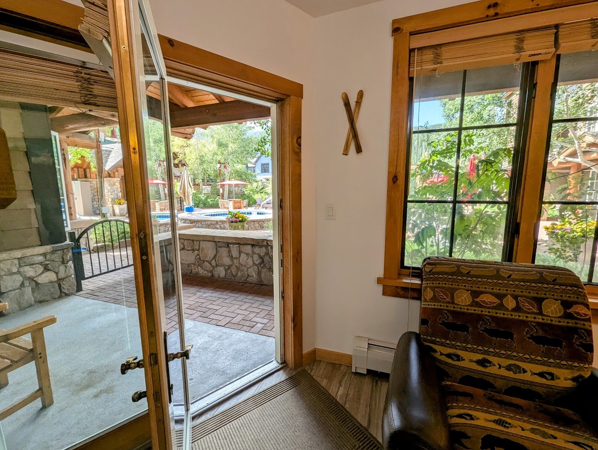 Upon entering, you'll encounter a warm and inviting atmosphere complemented by tasteful decor and cozy furnishings. The living space is designed for relaxation, offering a patio and direct access to the pool and hot tub area.