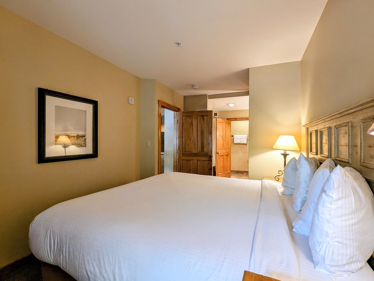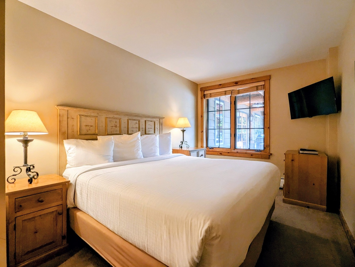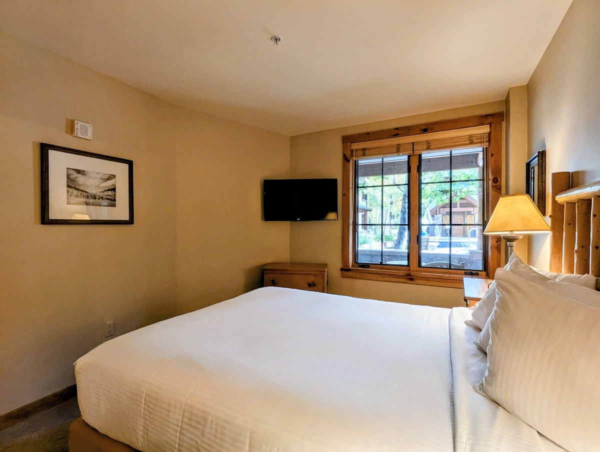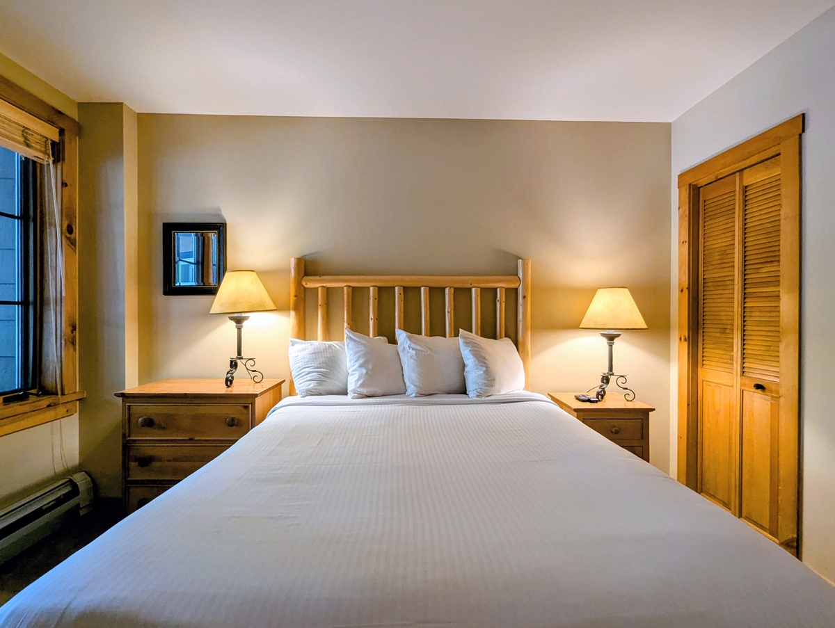 The condo boasts two serene bedrooms, each offering a peaceful retreat after a day of skiing or hiking. The rooms are tastefully decorated, with a warm light from the bedside lamp enhancing the cozy ambiance. The large windows in the bedrooms let in plenty of natural light during the day. The condo also includes two modern bathrooms to make getting ready in the morning a breeze.