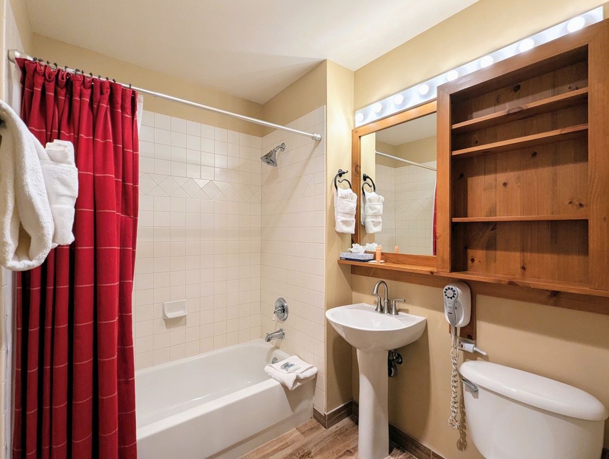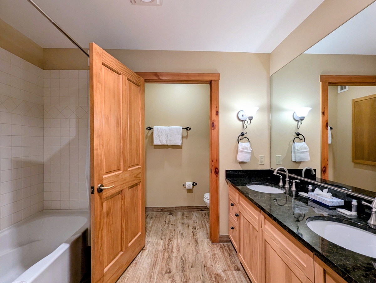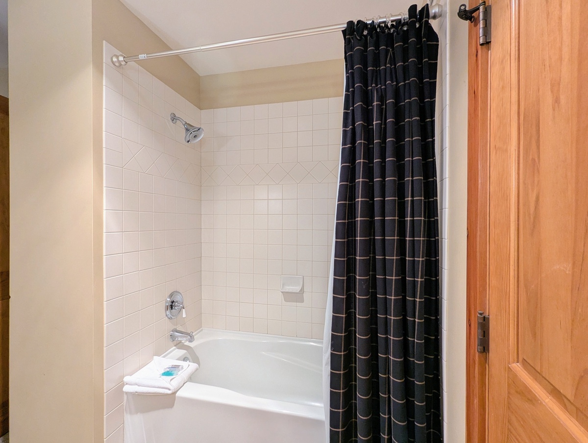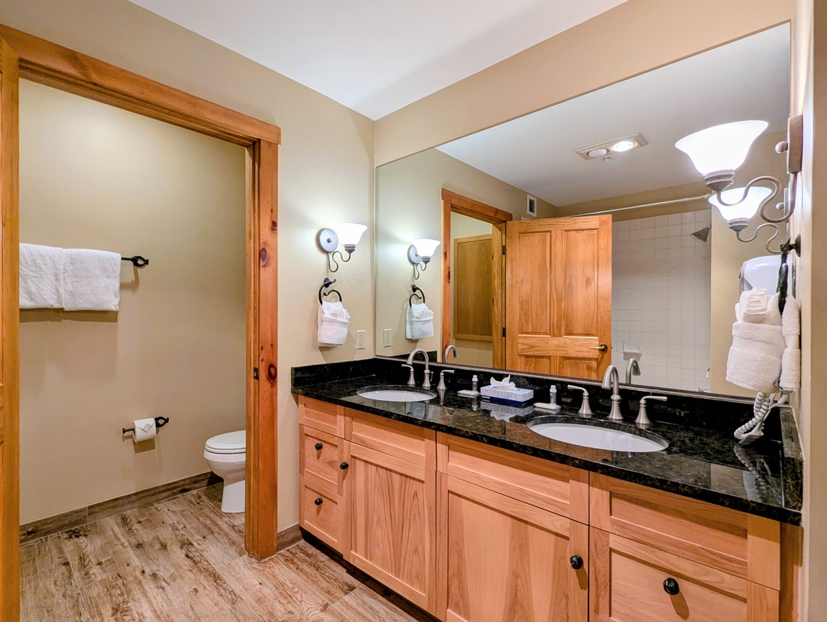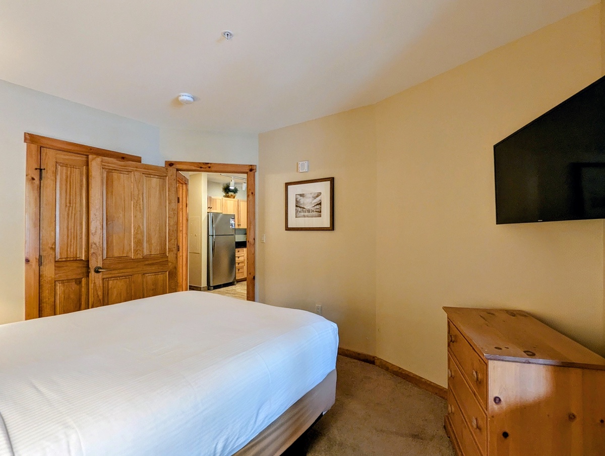 The condo boasts two serene bedrooms, each offering a peaceful retreat after a day of skiing or hiking. The rooms are tastefully decorated, with a warm light from the bedside lamp enhancing the cozy ambiance. The large windows in the bedrooms let in plenty of natural light during the day. The condo also includes two modern bathrooms to make getting ready in the morning a breeze.