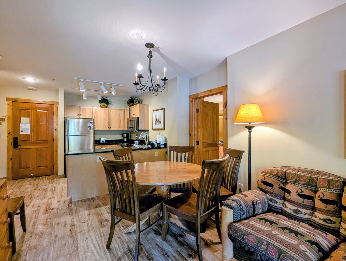 The living space extends into a well-equipped kitchen area, featuring a stainless steel refrigerator and other essential appliances. Adjacent to the kitchen, a wooden dining table sits under a charming chandelier, offering a perfect spot for family meals or game nights.