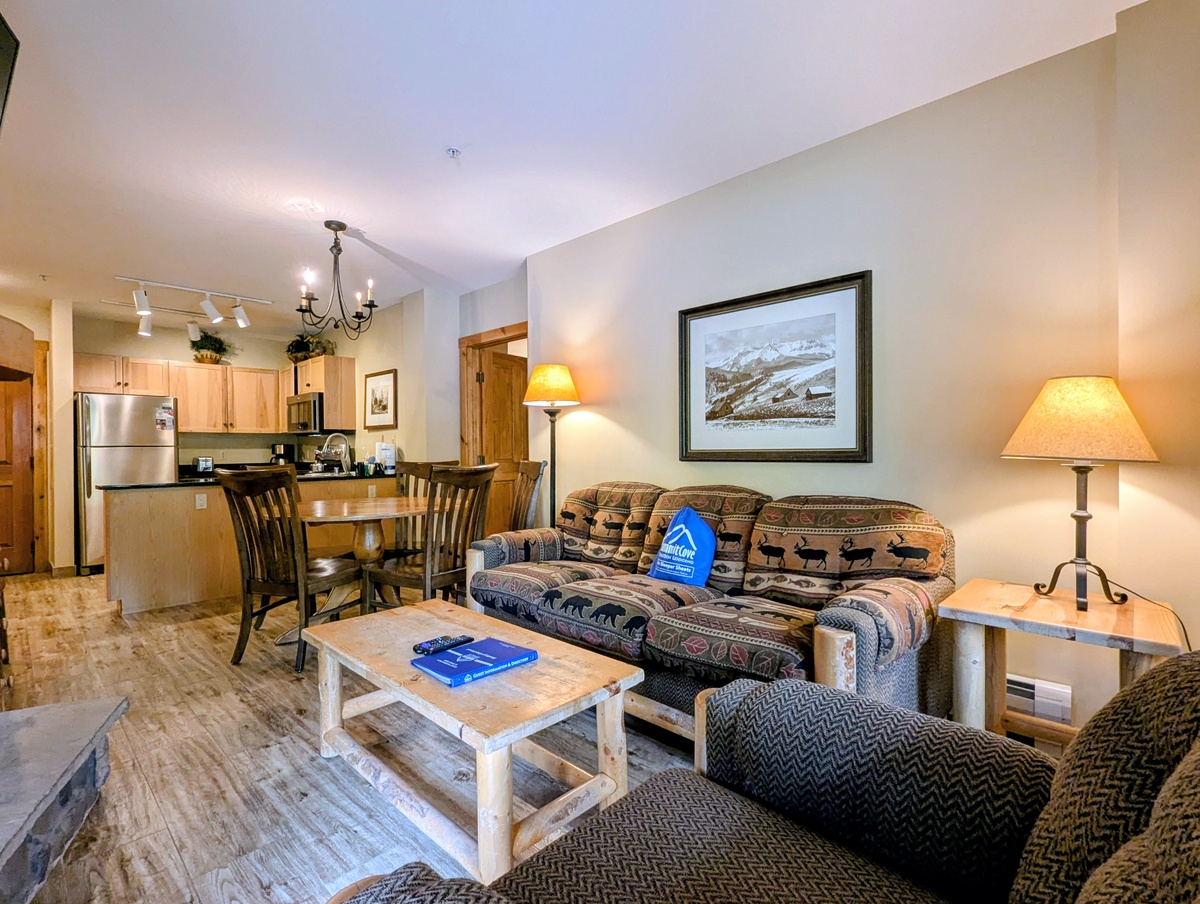 As you step inside, you're greeted by a cozy living room that exudes an inviting atmosphere. The comfortable couch is perfect for lounging after a day of adventure. The wooden coffee table and chair add a touch of rustic charm, while the ornamental lamp provides a warm glow. The focal point of the room is a beautiful mountain landscape painting, reminding you of the stunning natural beauty just outside your door.