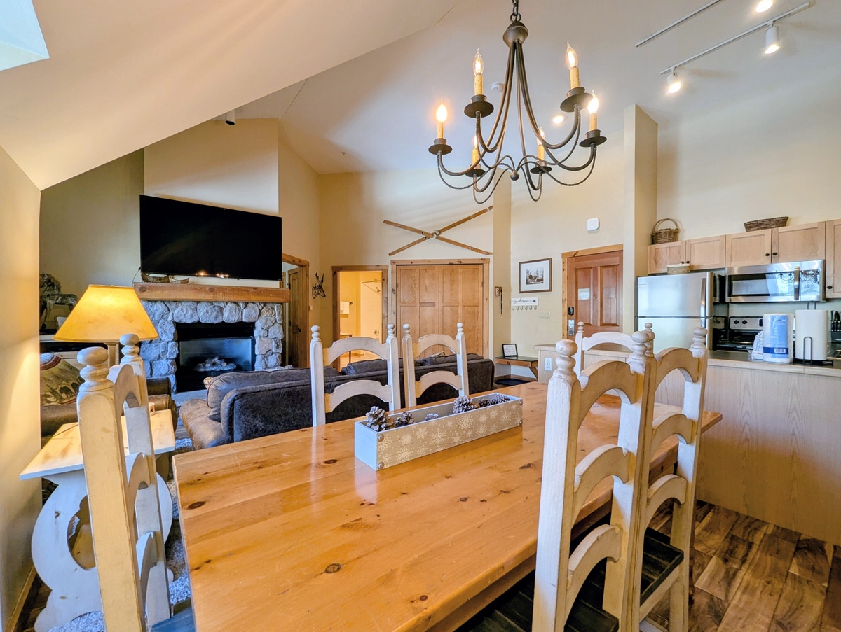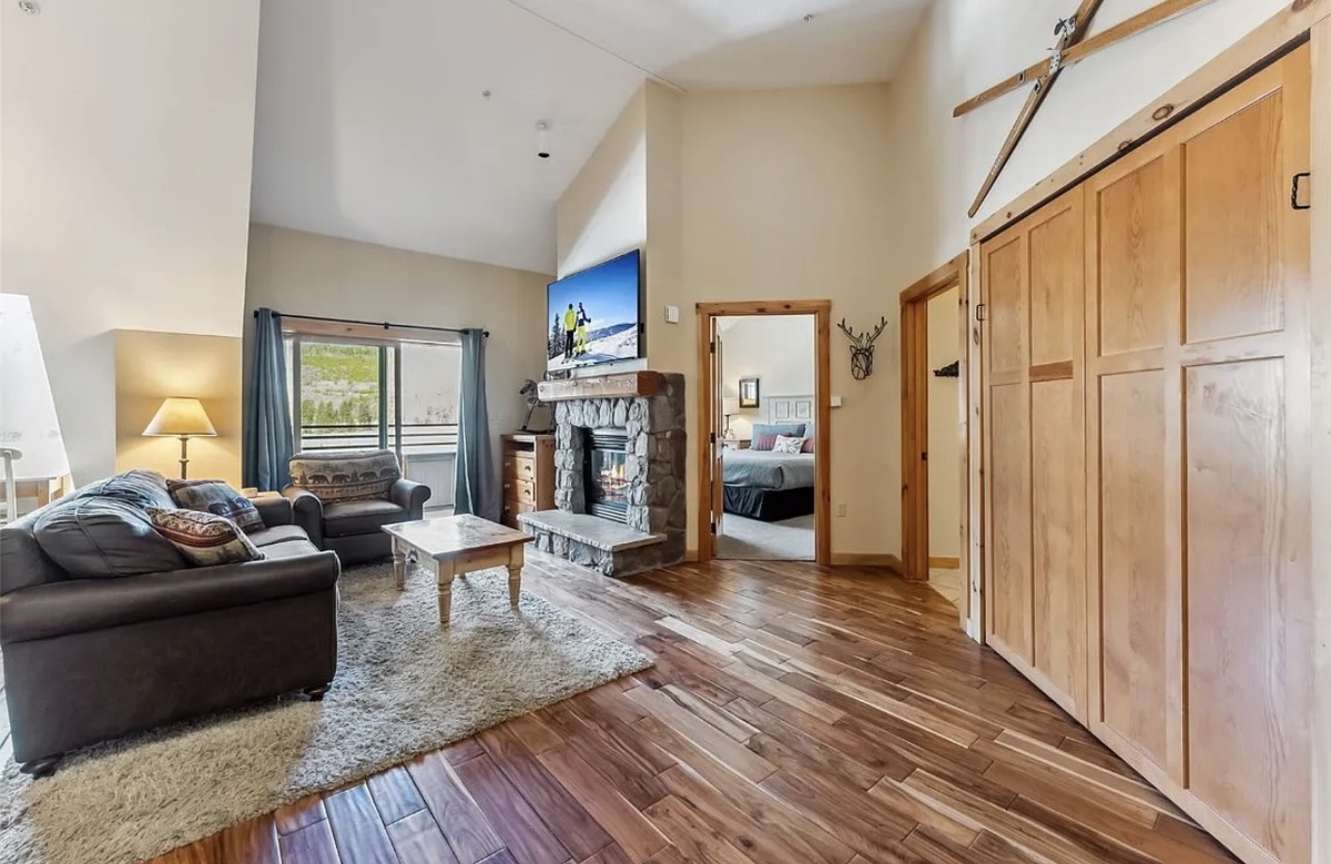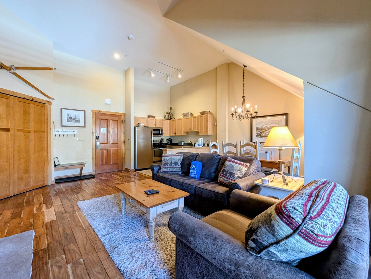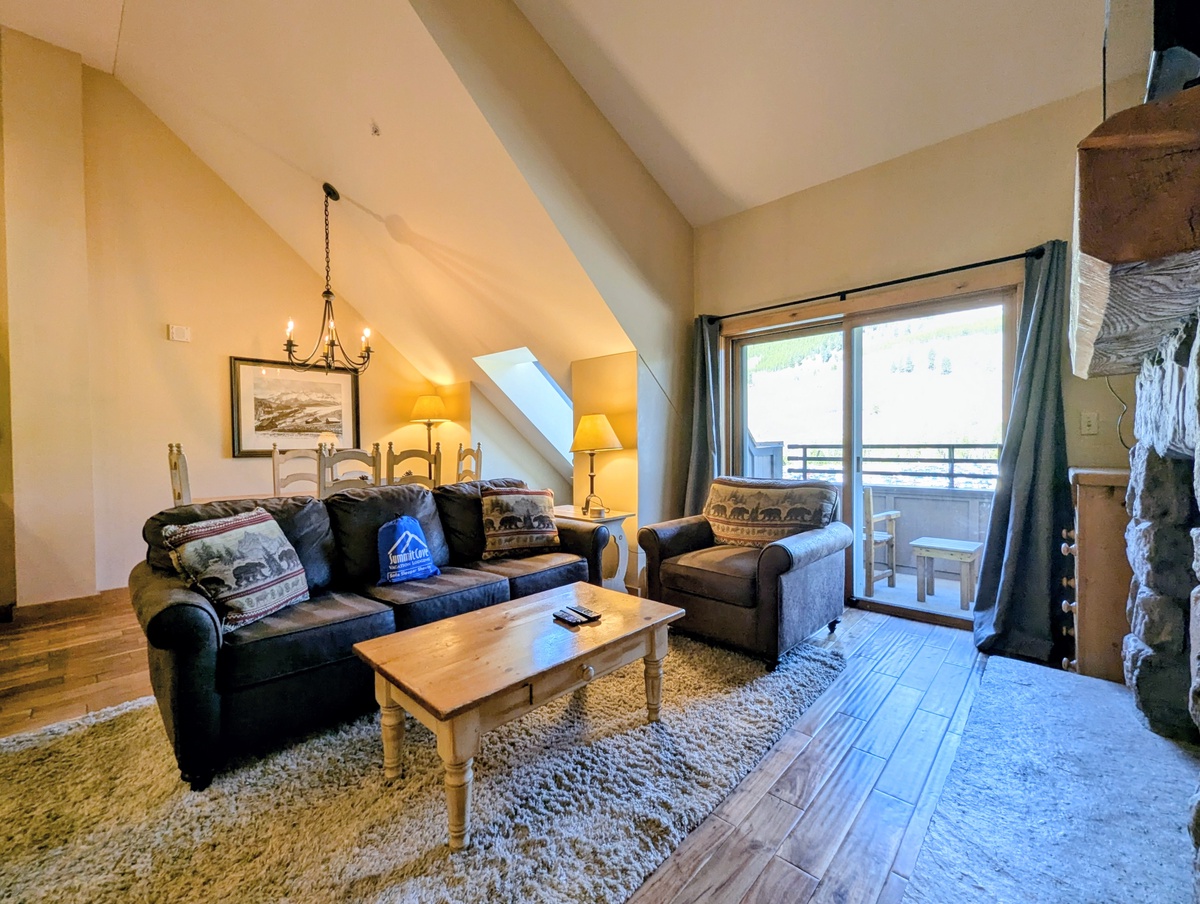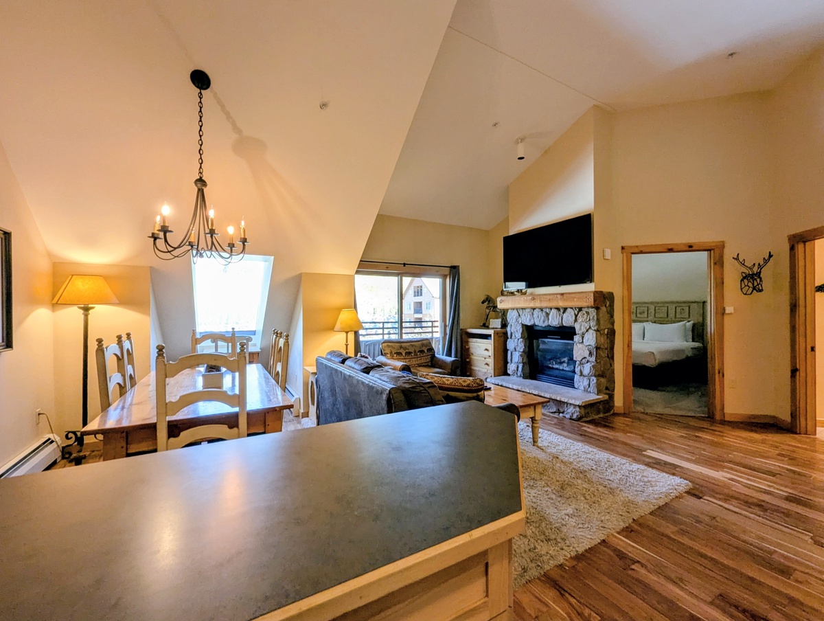 Visit this top-floor, oversized condo that combines the warmth of a mountain lodge with modern comfort and convenience, creating the ideal home base for your Colorado adventures. From the moment you step inside, you’ll be welcomed by a cozy, open-concept living space featuring rich wood finishes, mountain-inspired décor, and a gas fireplace that invites you to unwind after a day on the slopes. Large windows fill the space with natural light and offer beautiful views of the surrounding alpine scenery.