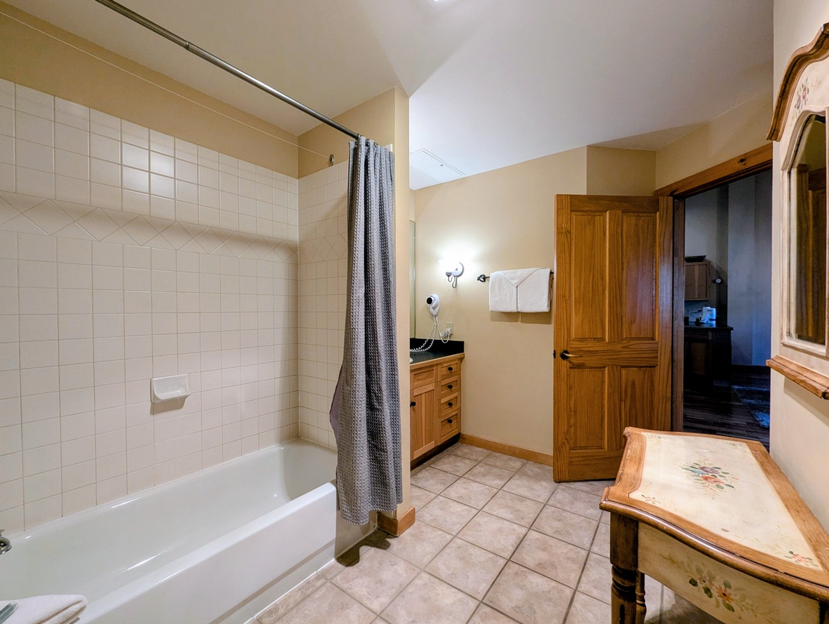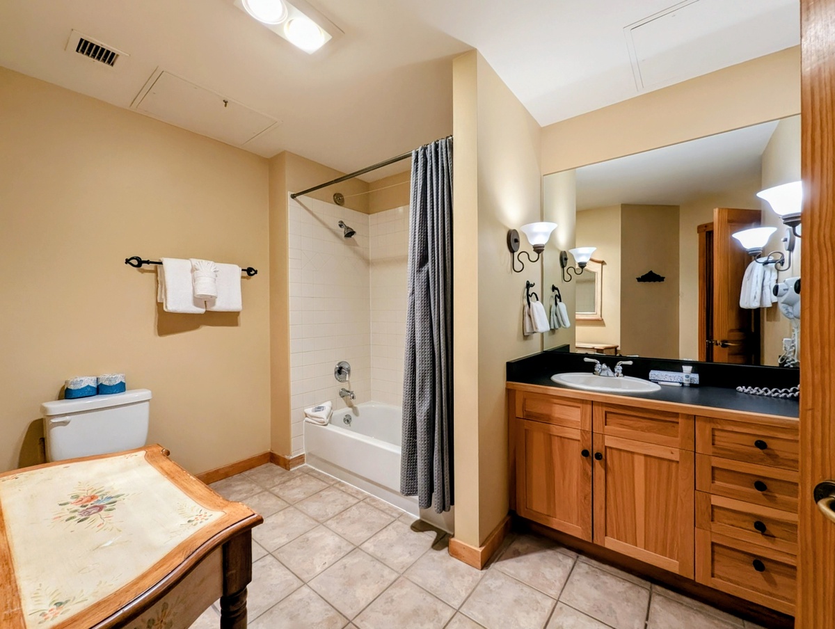 -Spacious bathroom with a shower/bathtub combo, for a warm soak