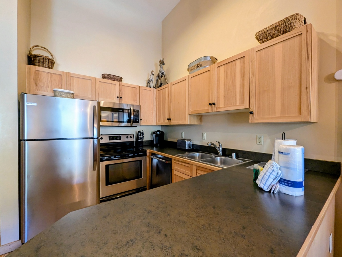 The fully equipped kitchen provides everything you need to prepare meals during your stay, with sleek stainless steel appliances and a spacious dining area perfect for gathering with friends or family. The living room extends to a private balcony—an ideal spot to enjoy your morning coffee or an evening glass of wine while taking in the crisp mountain air. The private, king bedroom offers a peaceful retreat, while the bathroom boasts updated fixtures and a relaxing tub/shower combination to rejuvenate after your outdoor adventures.