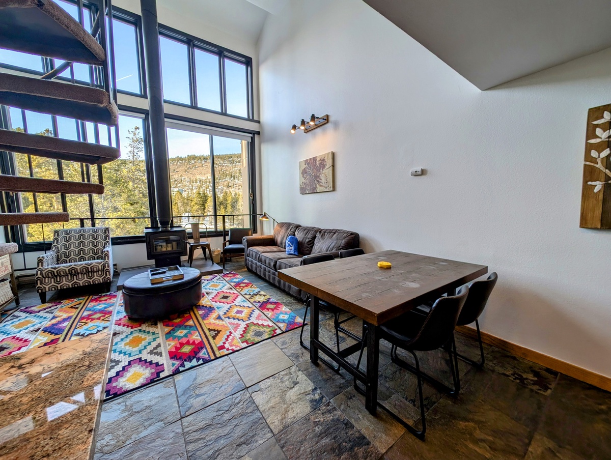 Upon entering, you’ll be welcomed into a spacious and sunlit living room that’s ideal for relaxing after a day of activities. With its plush seating, floor to ceiling windows, and a large TV, this space invites you to unwind and enjoy a peaceful evening indoors.