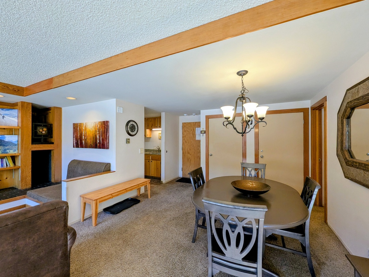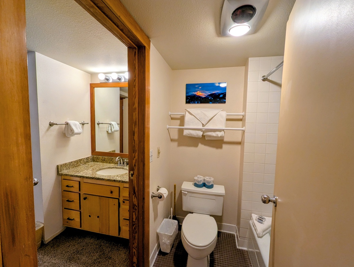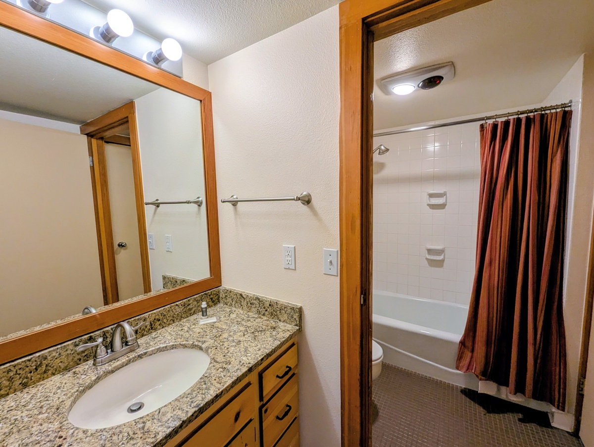 The condo’s interior feels bright and welcoming, with comfortable furnishings, tasteful décor, and a layout that flows easily from the living area into the dining and kitchen spaces. Large windows bring in natural light and hint at the surrounding mountain atmosphere, making it easy to unwind with a cup of coffee in the morning or relax in the evening after a day outdoors. The kitchen is well-equipped for preparing meals at home, whether you’re planning a quick breakfast before hitting the slopes or a relaxed dinner in. The bathroom features a Jack & Jill sink with plenty of counter space.