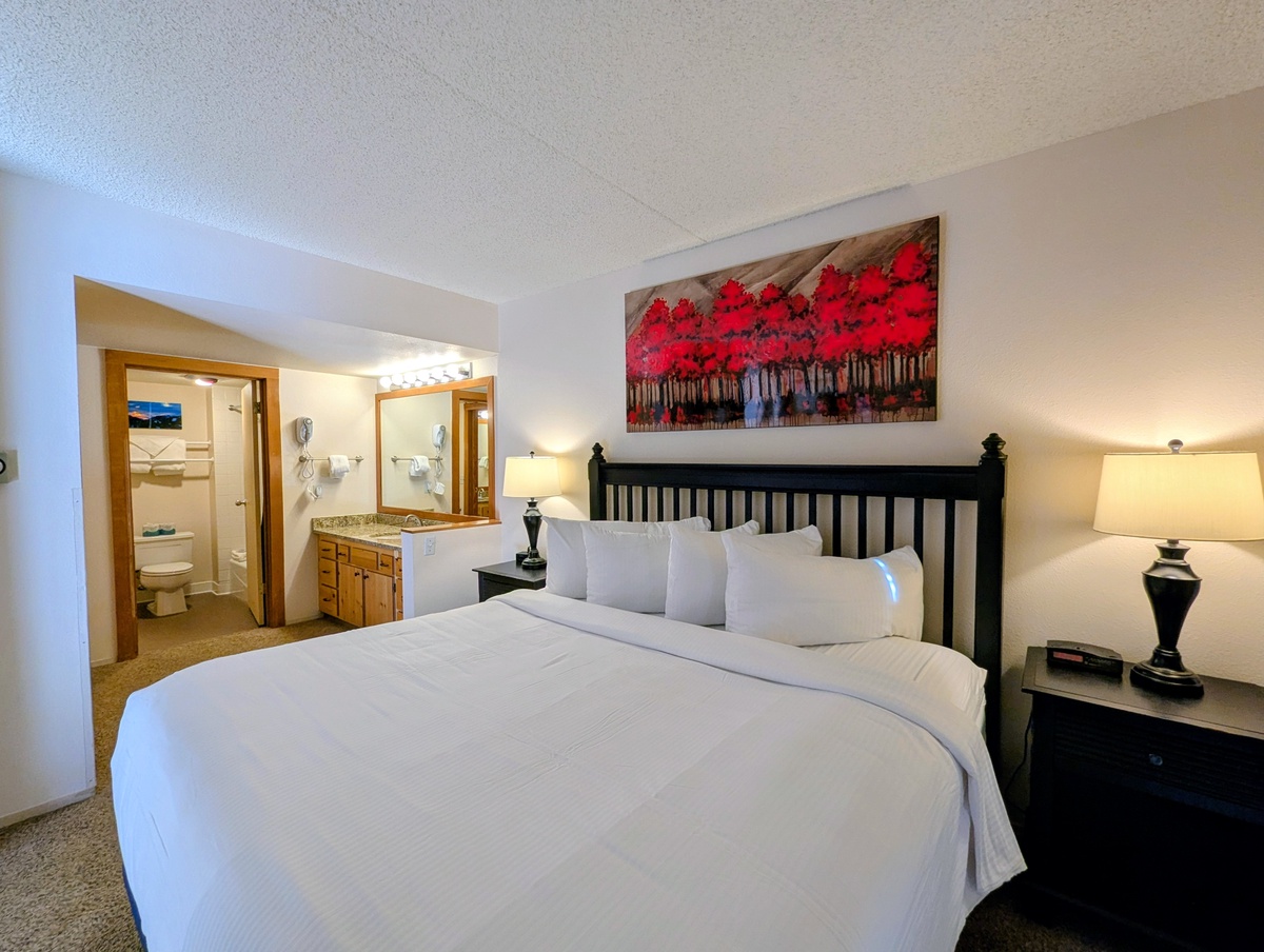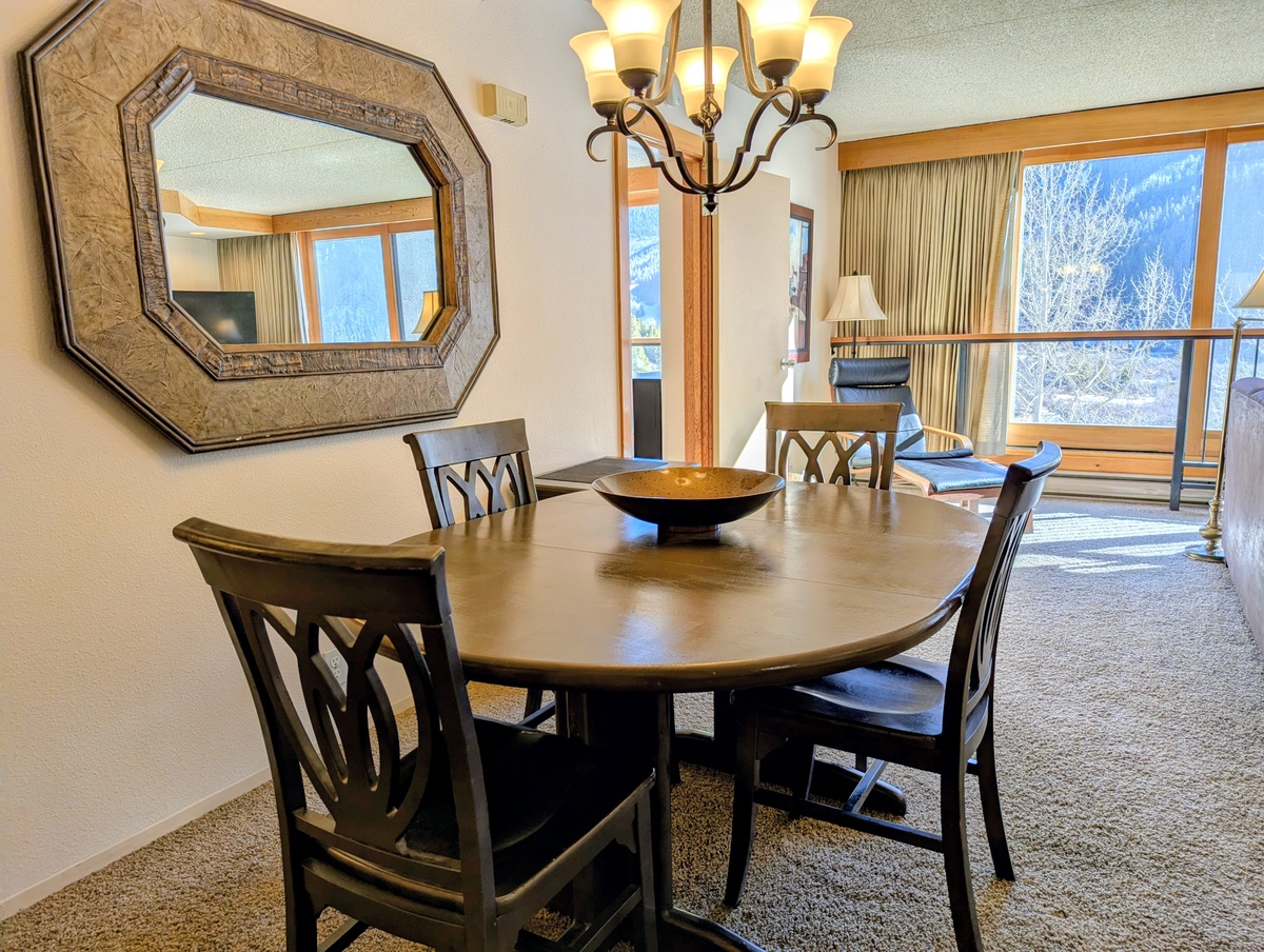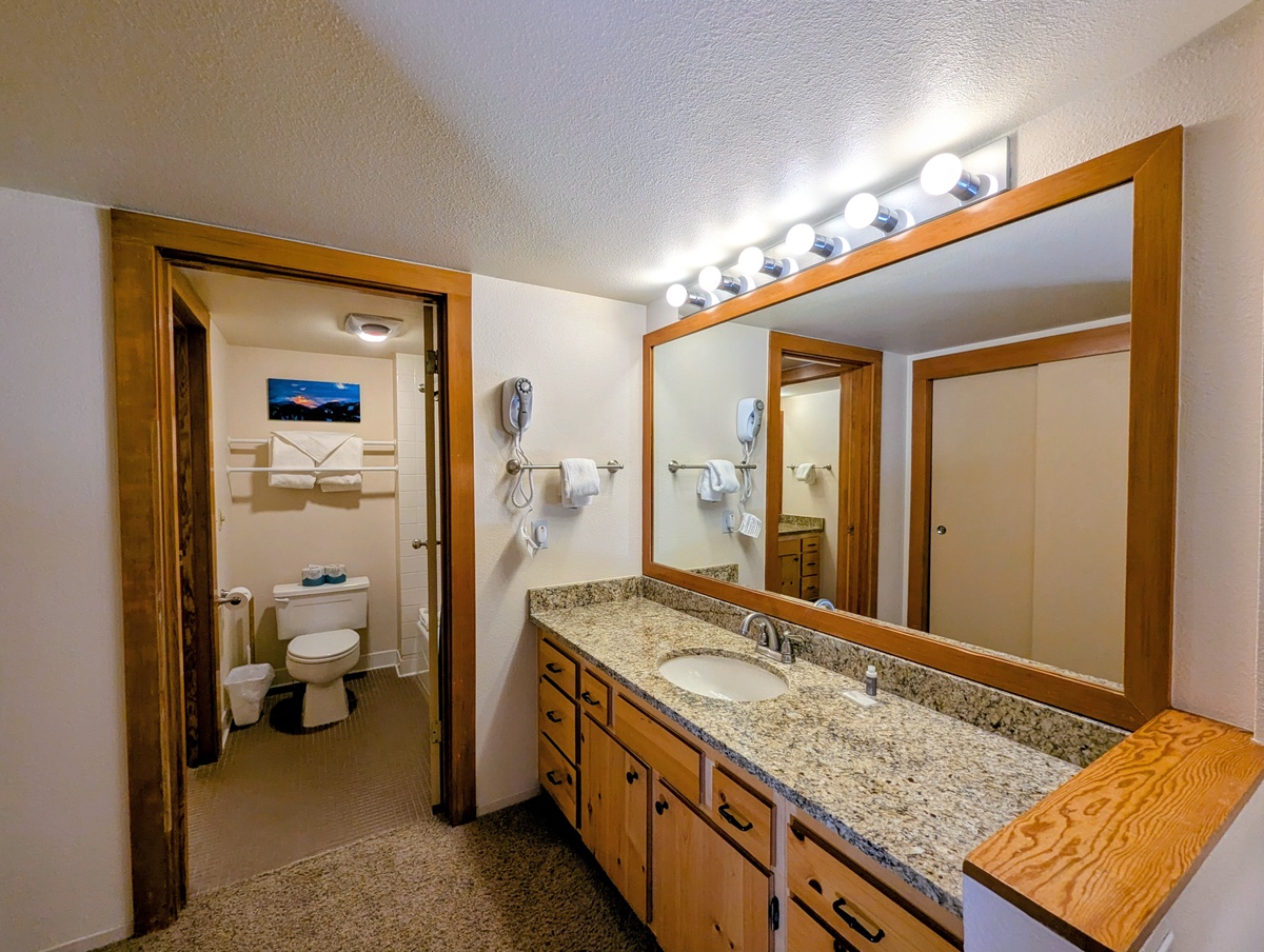 The condo’s interior feels bright and welcoming, with comfortable furnishings, tasteful décor, and a layout that flows easily from the living area into the dining and kitchen spaces. Large windows bring in natural light and hint at the surrounding mountain atmosphere, making it easy to unwind with a cup of coffee in the morning or relax in the evening after a day outdoors. The kitchen is well-equipped for preparing meals at home, whether you’re planning a quick breakfast before hitting the slopes or a relaxed dinner in. The bathroom features a Jack & Jill sink with plenty of counter space.