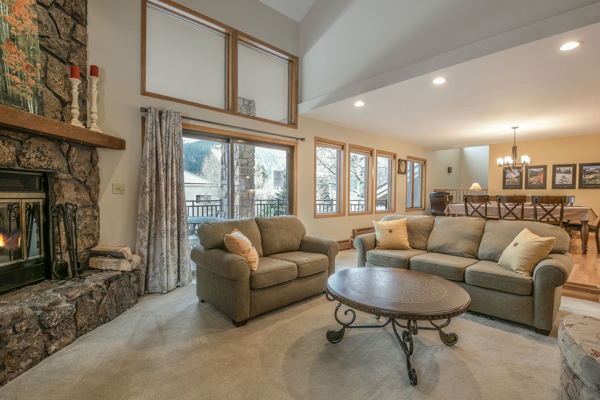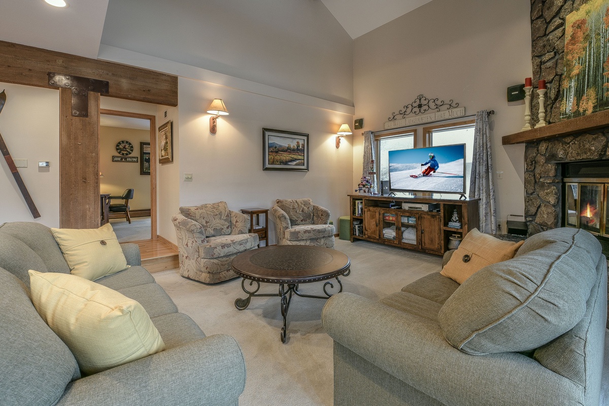 As soon as you step inside, you'll be blown away by the spacious and open layout of the main living area. With high ceilings, large windows, and stylish furnishings, this space is perfect for entertaining family and friends. Relax on the comfortable couches while you warm up by the fireplace or root for your favorite team on the flat-screen TV.