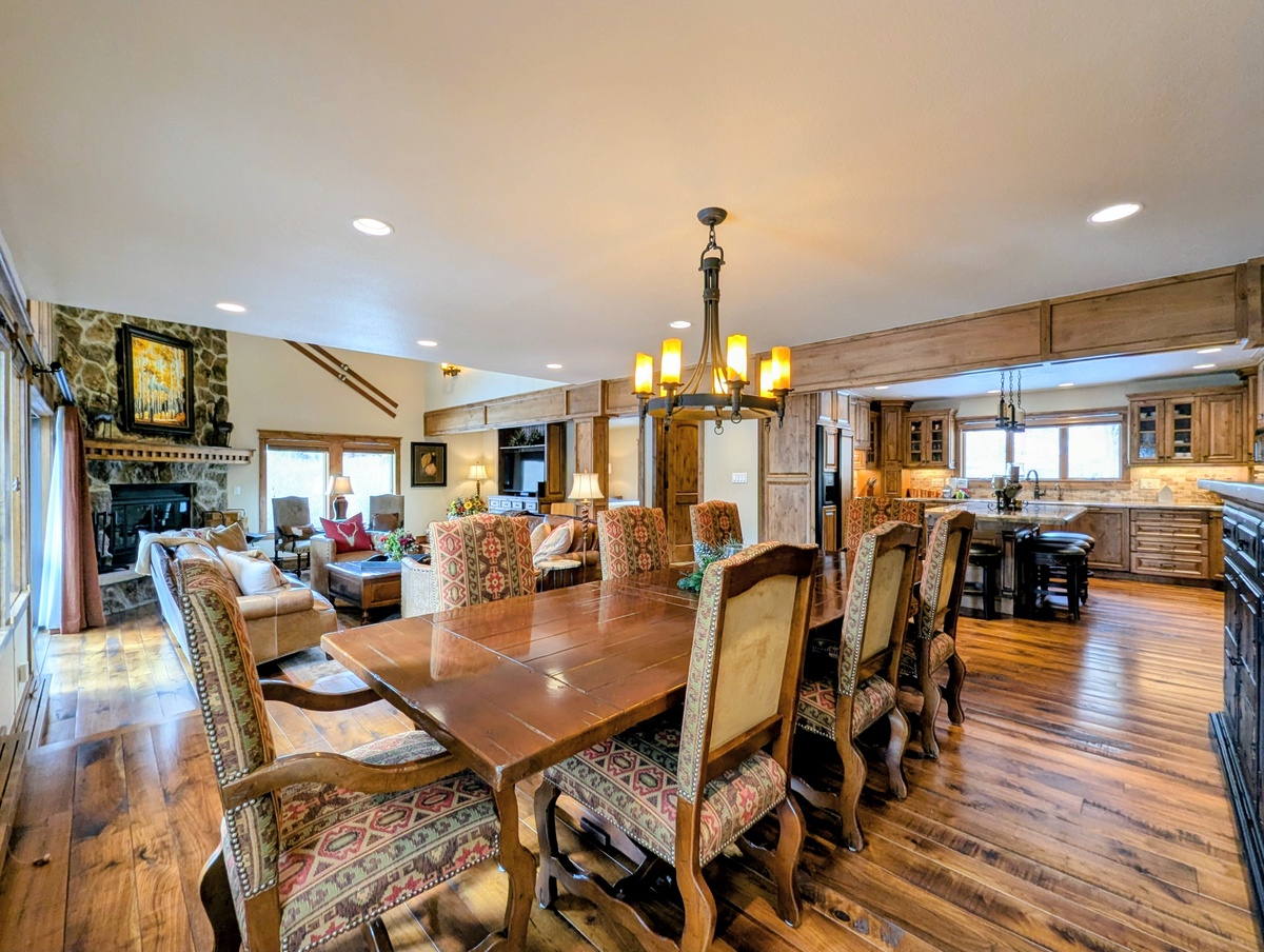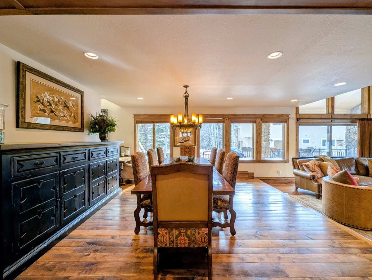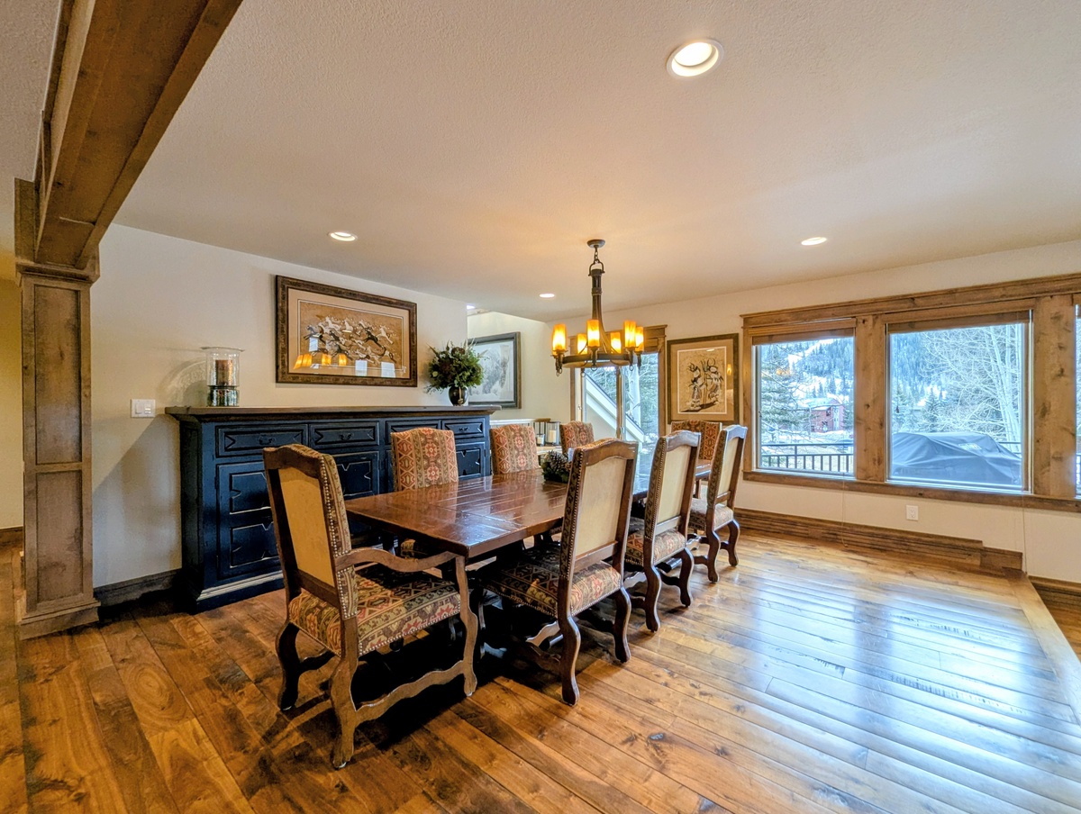 The fully equipped kitchen makes group meals easy and enjoyable. With generous counter space, modern appliances, and all the cookware you need, preparing everything from quick breakfasts to full holiday dinners is a breeze. The adjacent dining area offers plenty of room to sit, share stories from the slopes, and plan the next day’s adventures.