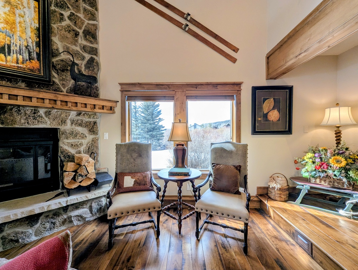Step inside and you’re welcomed by a bright, open living space designed for gathering after a day outdoors. Large windows invite in natural light and frame scenic mountain views, while comfortable seating creates an inviting place to unwind. Whether you’re warming up with a mug of cocoa in winter or relaxing after a summer hike, this living area is the heart of the home where everyone comes together.