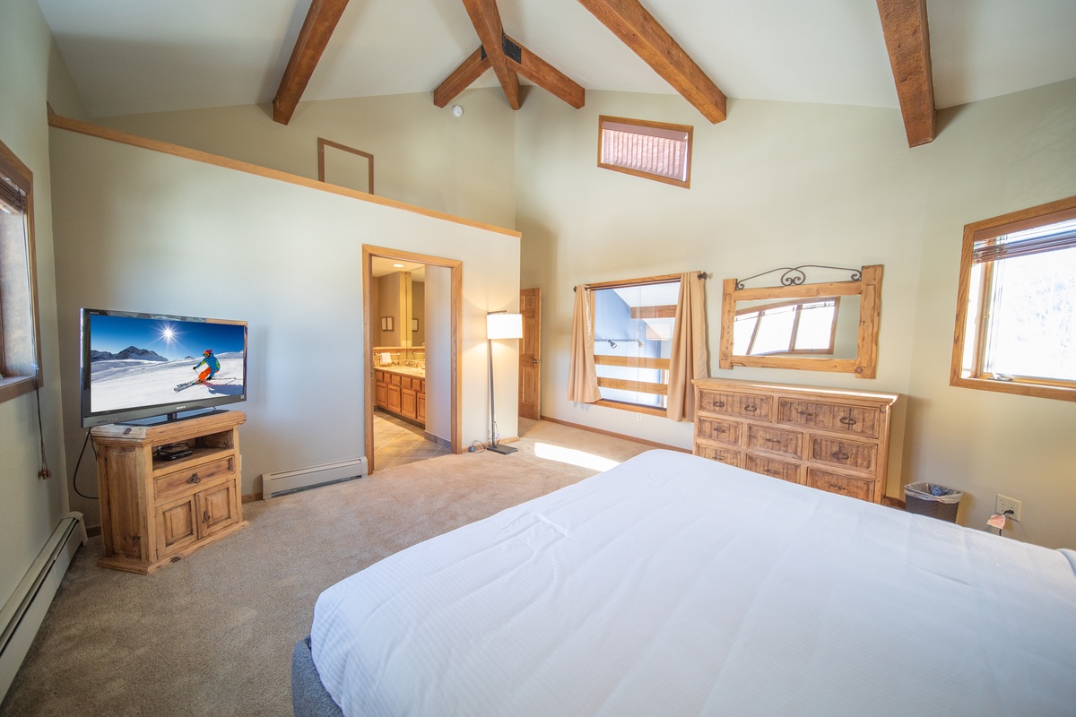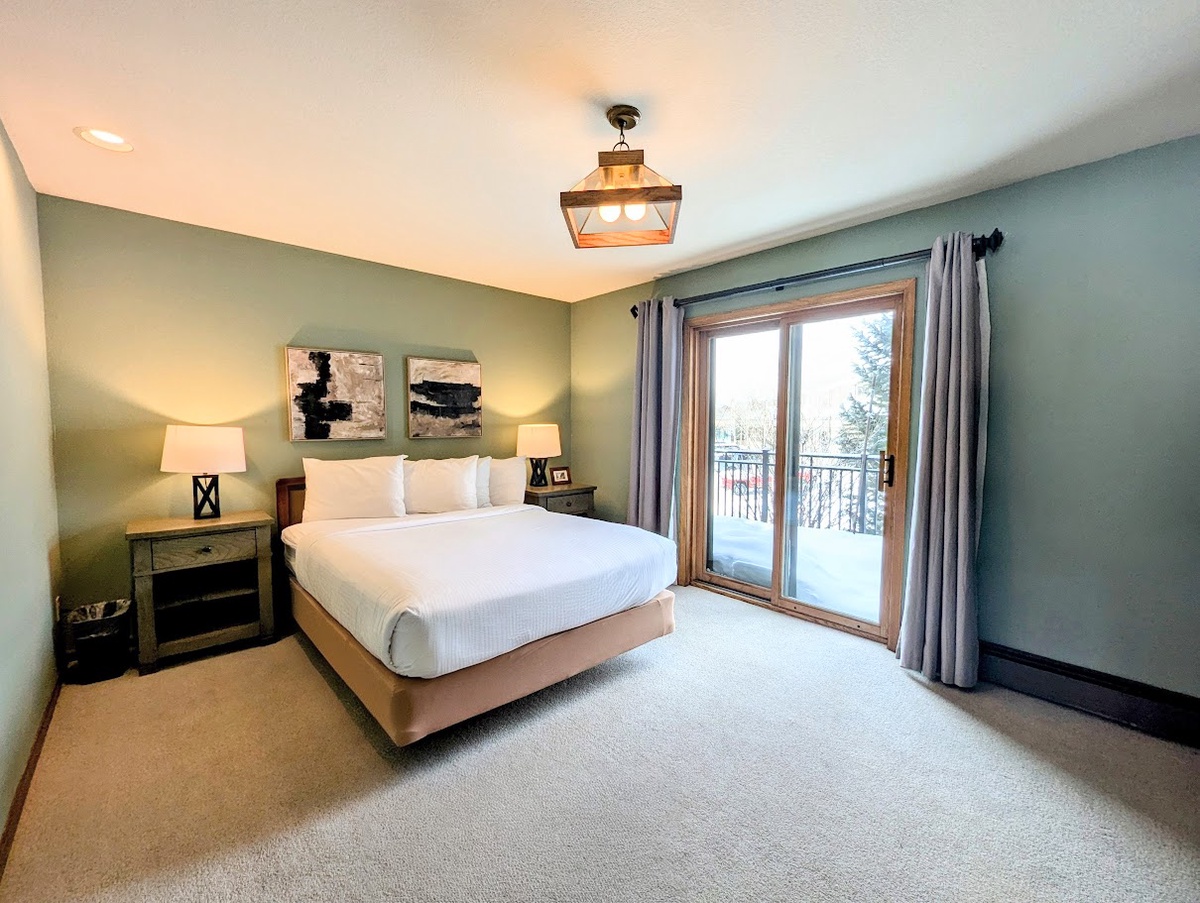 Inside, the townhome is designed to maximize your comfort. The inviting living room is perfect for movie nights or relaxing by the fire, and the fully equipped kitchen makes preparing meals a breeze. When it's time to relax, the luxurious master bedroom offers a serene retreat with a spacious bed and a private en suite bathroom featuring a large walk-in shower.