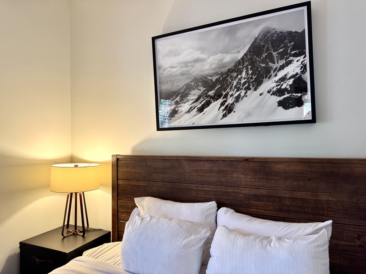 Just outside the living area, a spacious patio serves as a serene spot for morning coffees, soaking up the sun, or watching the world go by. With the stunning Rocky Mountains framing your view, every moment spent here is a breath of fresh air. The condo's interior also extends to a well-appointed bedroom, featuring ample storage, ensuring a restful night's sleep after a day of mountain adventures.
