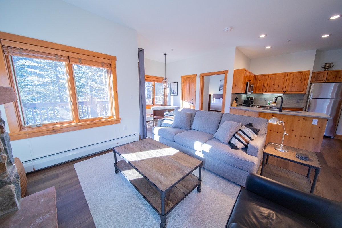 The generously proportioned, open-concept living area boasts a comfy seating ensemble, an elegant dining area, and a modern, fully-equipped kitchen ready to inspire your culinary adventures. Relax on plush furniture, basking in the glow of the fireplace as you recount your day's adventures. The dining area ensures every meal becomes a delightful experience against the backdrop of serene mountain views.
