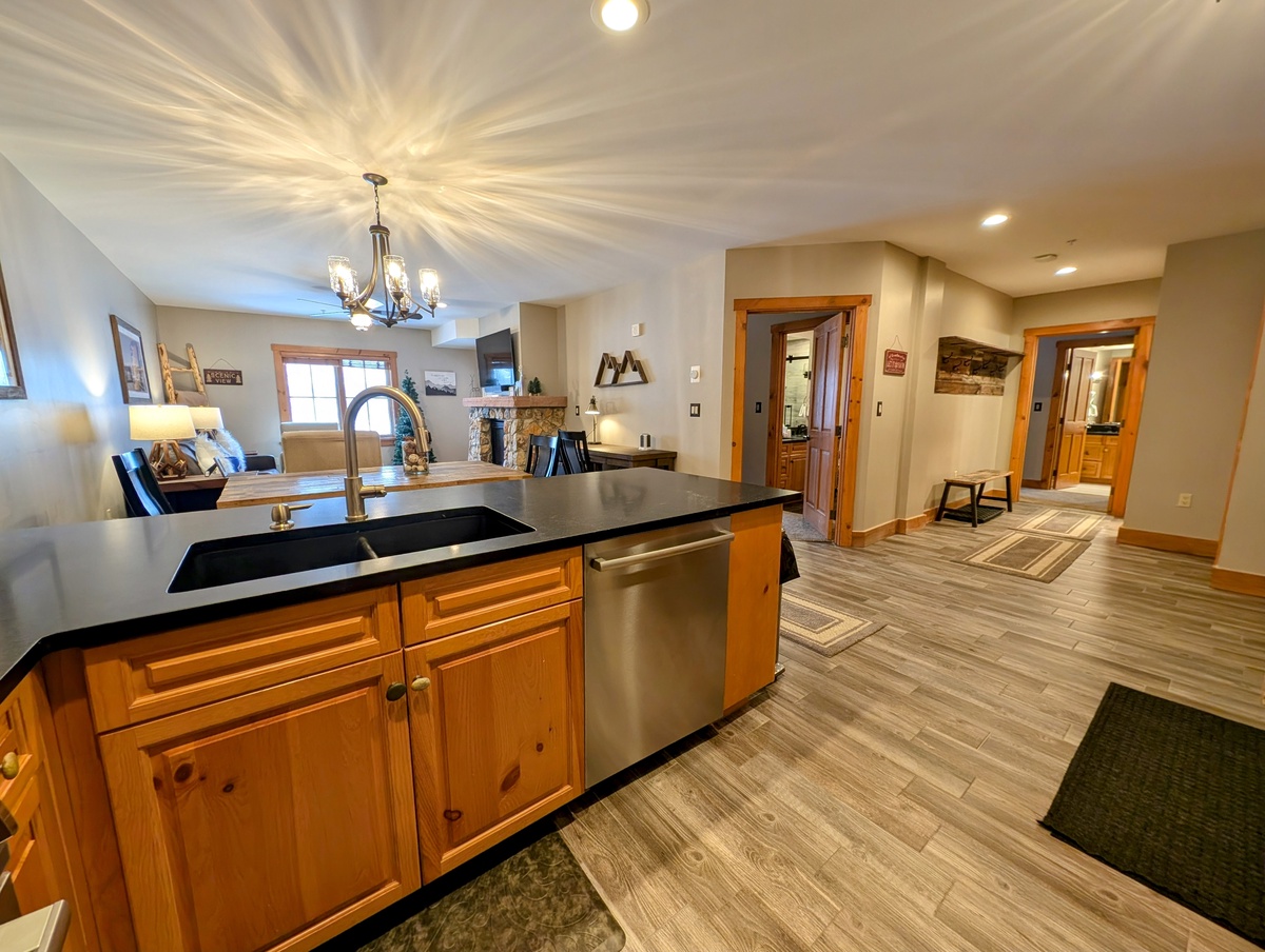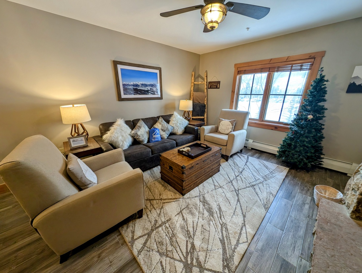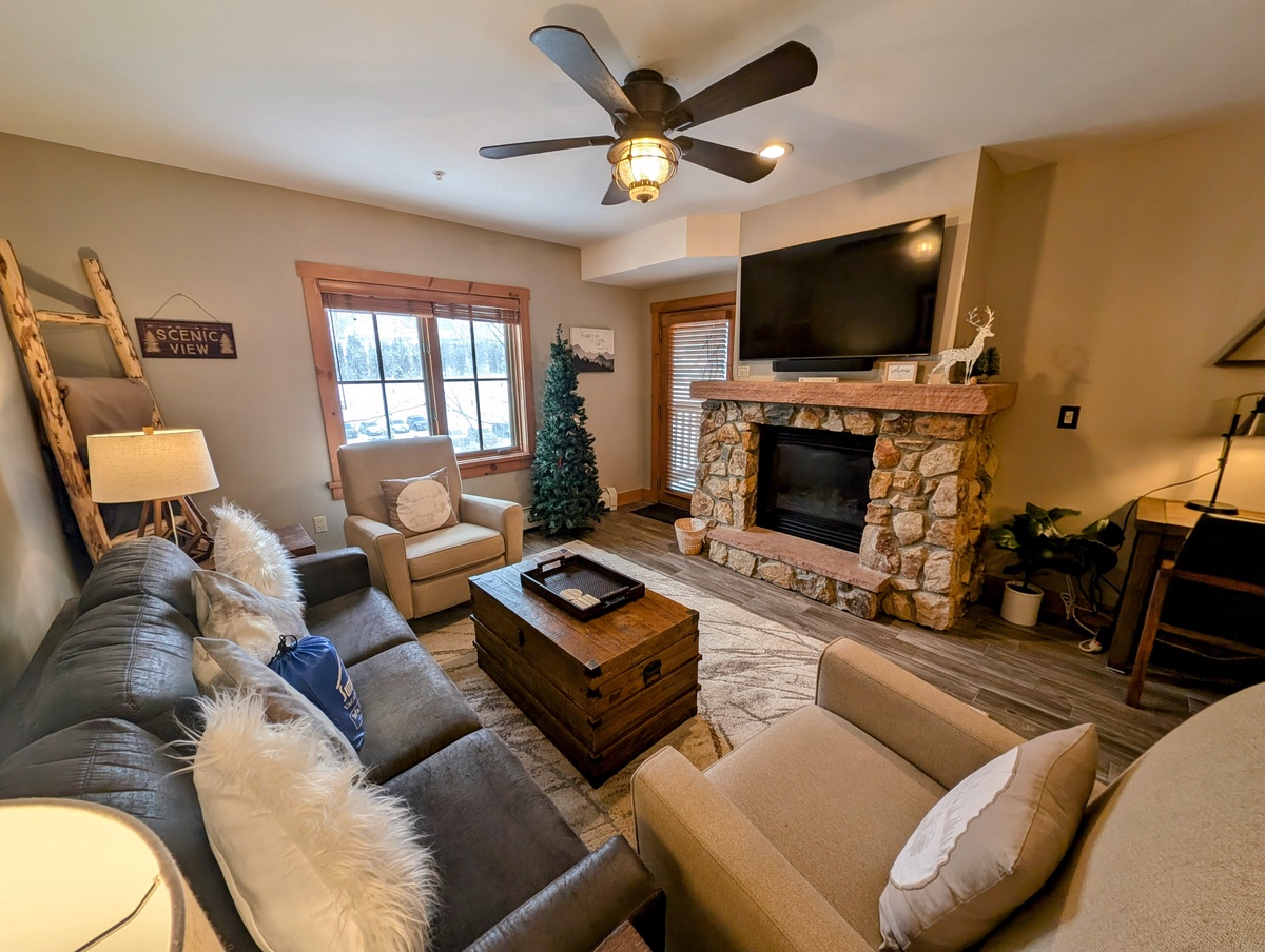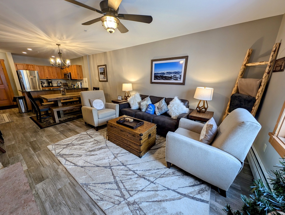 Step inside this tastefully furnished condo and be greeted by an inviting and spacious living area. The open floor plan seamlessly connects the living room, dining area, and kitchen, creating a warm and welcoming atmosphere. Large windows bathe the space in natural light, illuminating the cozy furnishings and elegant decor. Sink into the plush sofa, gather around the fireplace, and relish in the comfort and tranquility of this mountain retreat.