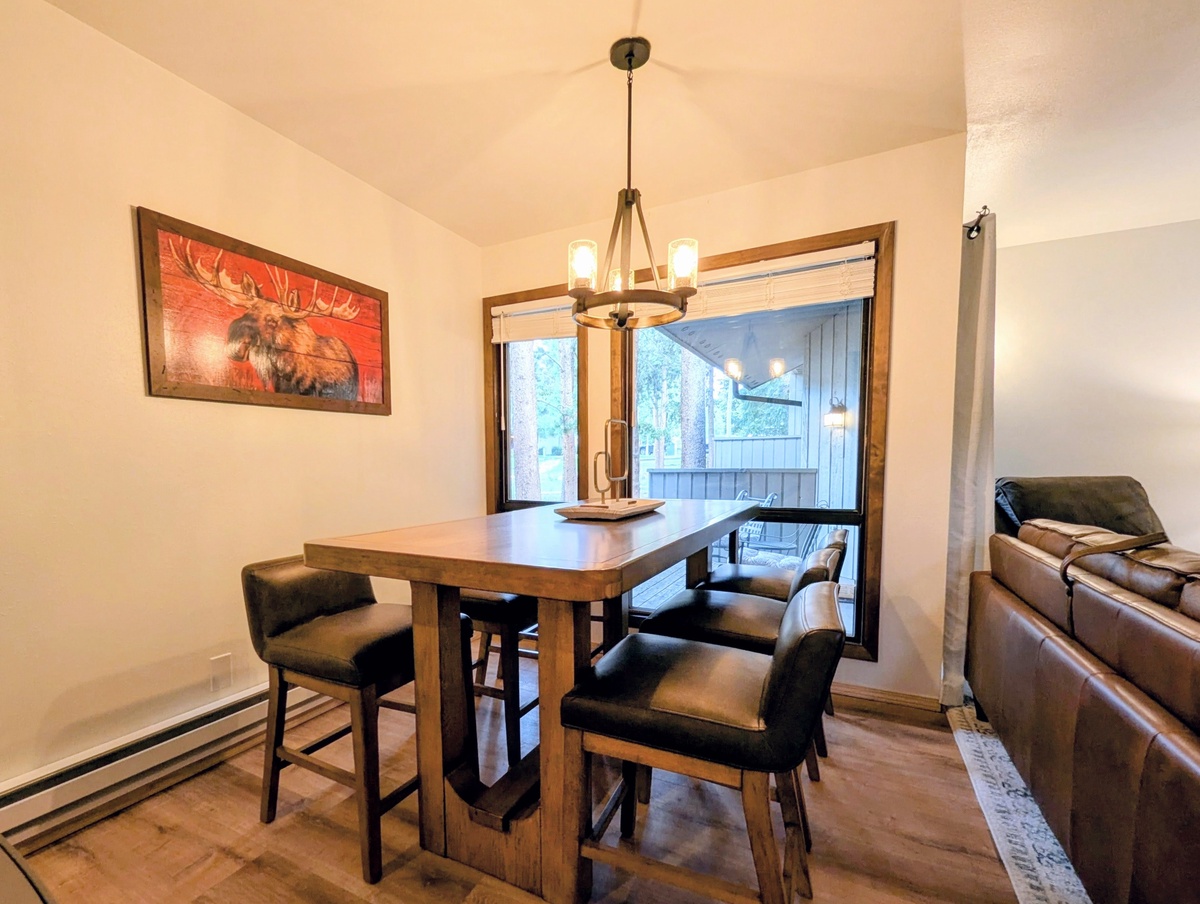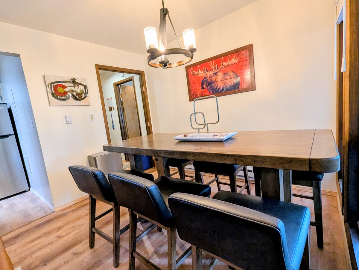 The fully equipped kitchen features stainless steel appliances, plenty of counter space, and everything you need to prepare meals at home. A dining area nearby offers a great spot to gather with friends and family for hearty breakfasts or evening dinners together.