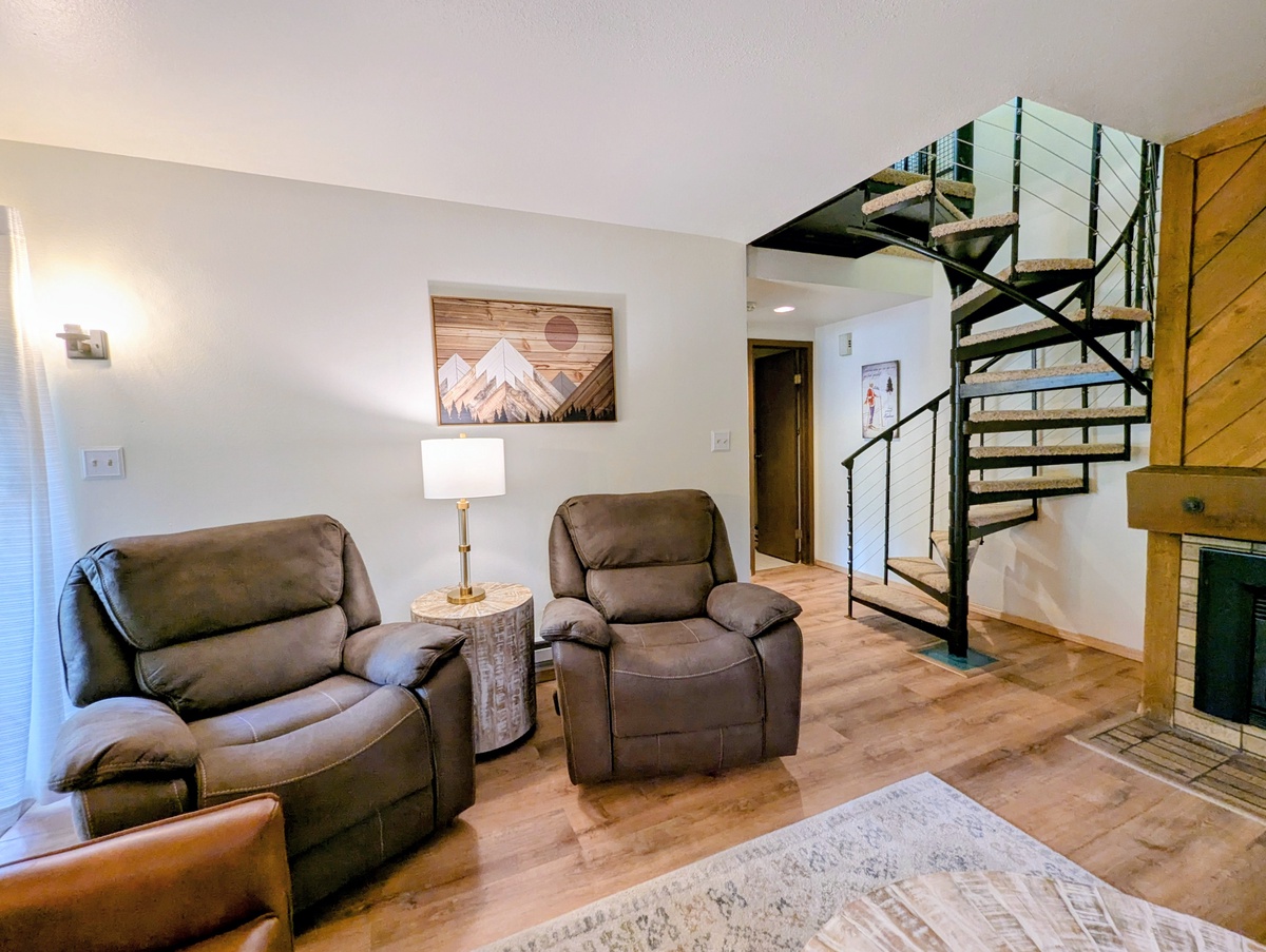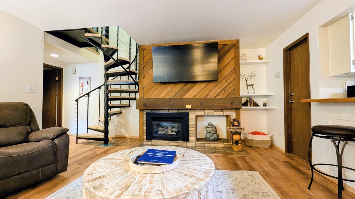 Inside, you’ll find a warm, open living space with rustic mountain charm. Large windows frame forest views, a cozy fireplace sets the perfect mood after a day outdoors, and comfortable seating makes it easy to relax. Whether you’re watching a movie, playing games, or sharing stories by the fire, the living room is designed for connection and comfort. A spiral staircase leads to a fun bonus space with bunk beds that are perfect for kids, allowing everyone to spread out and unwind.