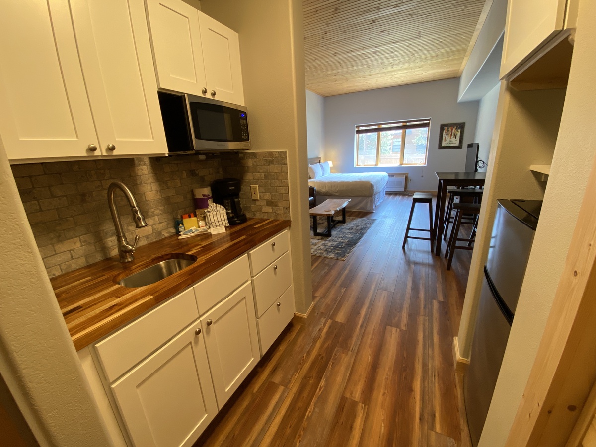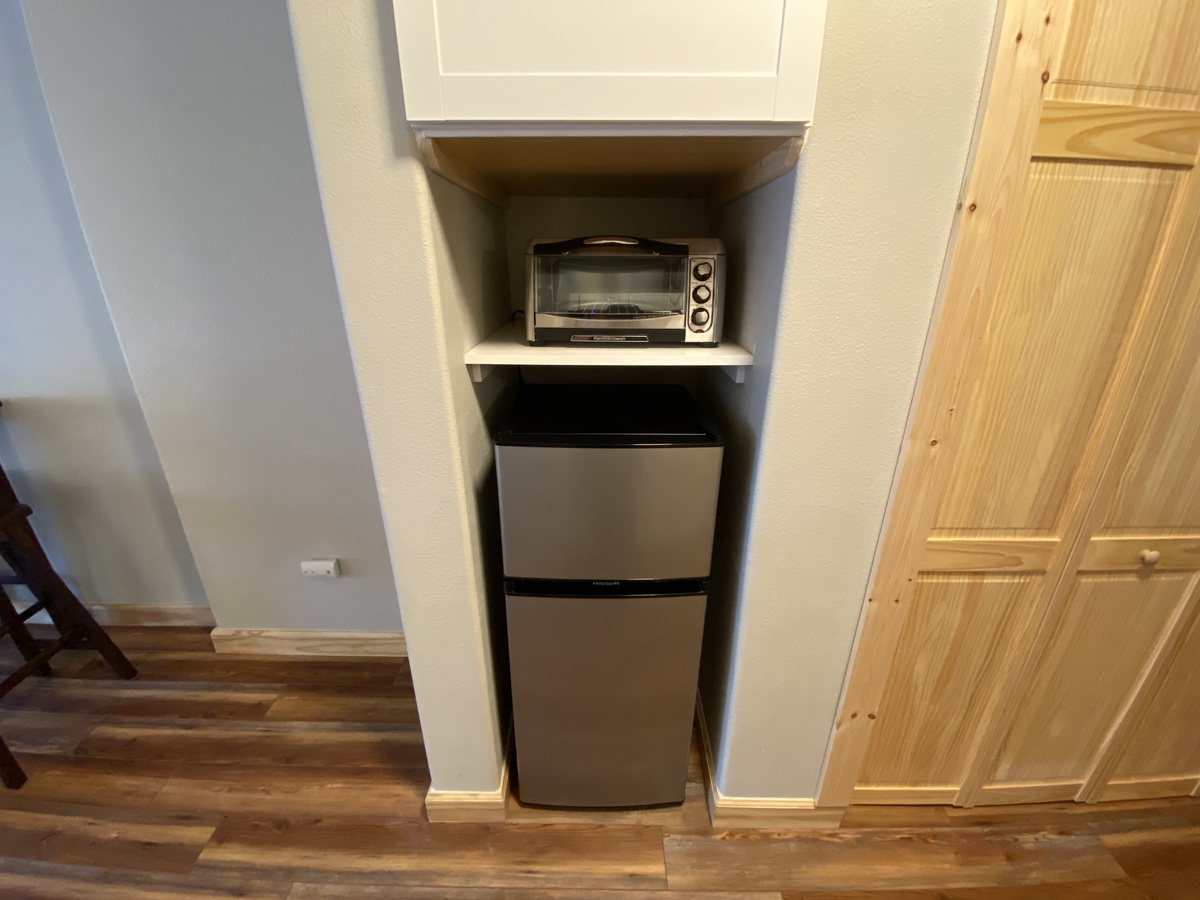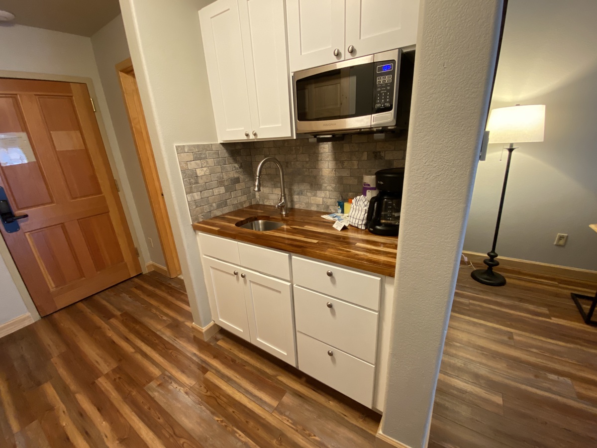 The fully-equipped kitchenette features a microwave, toaster oven, 3/4 refrigerator, and coffee maker. Whether you prefer a quick breakfast before hitting the slopes or a simple dinner, this kitchenette will meet all your needs.