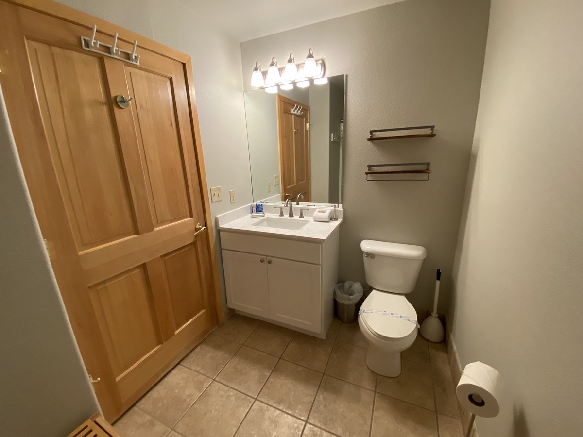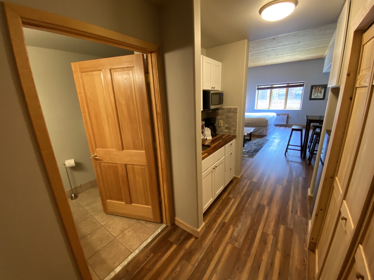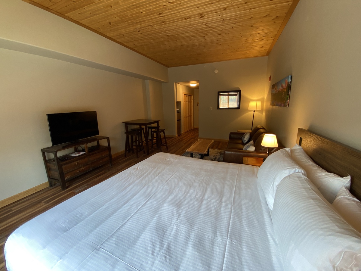 The fully-equipped kitchenette features a microwave, toaster oven, 3/4 refrigerator, and coffee maker. Whether you prefer a quick breakfast before hitting the slopes or a simple dinner, this kitchenette will meet all your needs.