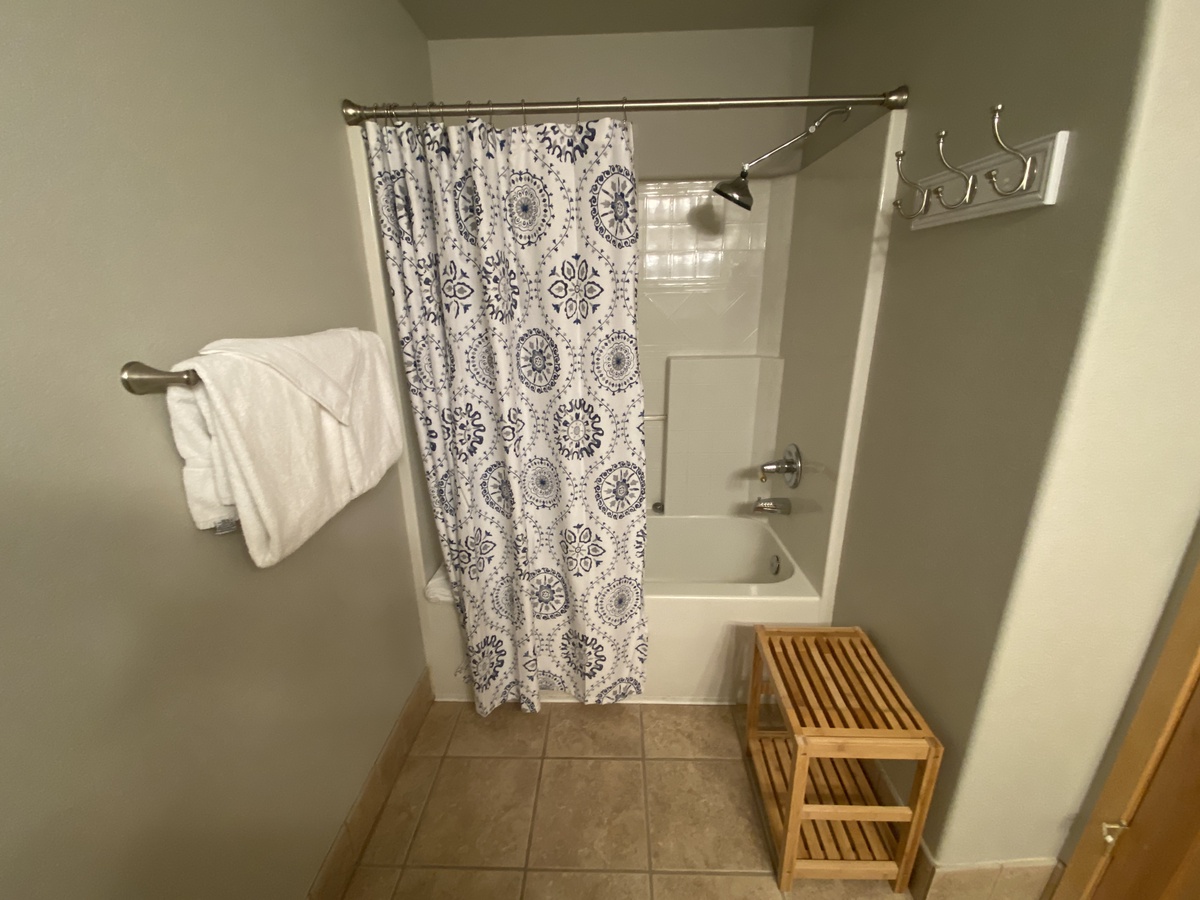 The bed is cozy and features comfortable bedding and linens, ensuring a good night's sleep after an adventure-packed day. The bathroom is equipped with modern amenities, where you can relax and unwind.