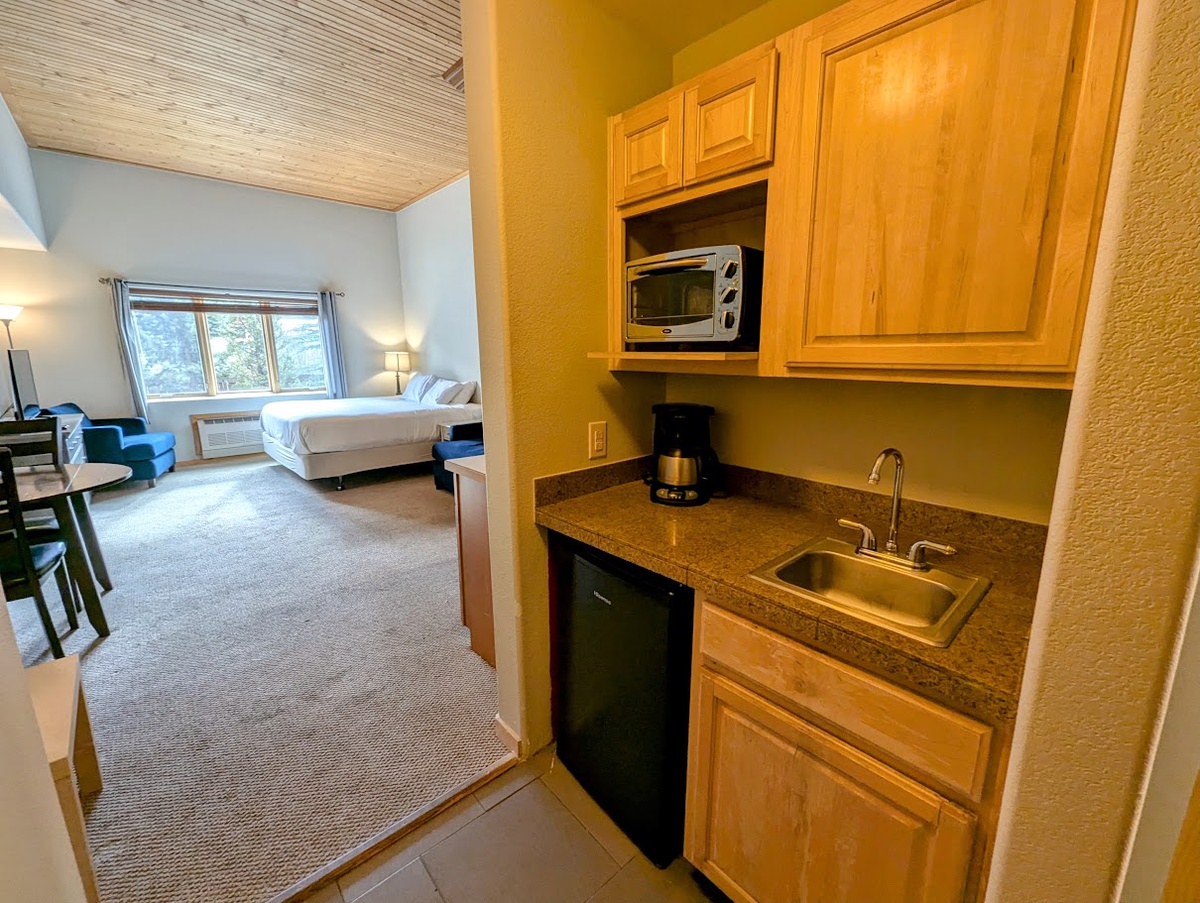 The studio condo features an open-concept layout that is complemented by amazing natural lighting. The interior design is inviting, with tasteful furnishings and elegant decor choices that create a warm and welcoming atmosphere that will immediately make you feel at home. This condo is equipped with everything you need to enjoy a comfortable stay, including a kitchenette, private bathroom, and living spaces designed for relaxation and comfort.
