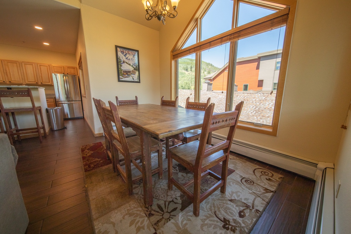 The fully equipped kitchen is perfect for cooking up delicious meals and comes complete with all the necessary appliances and utensils. The dining area offers ample seating for your group. Enjoy your meals while admiring the beautiful scenery through the large windows.