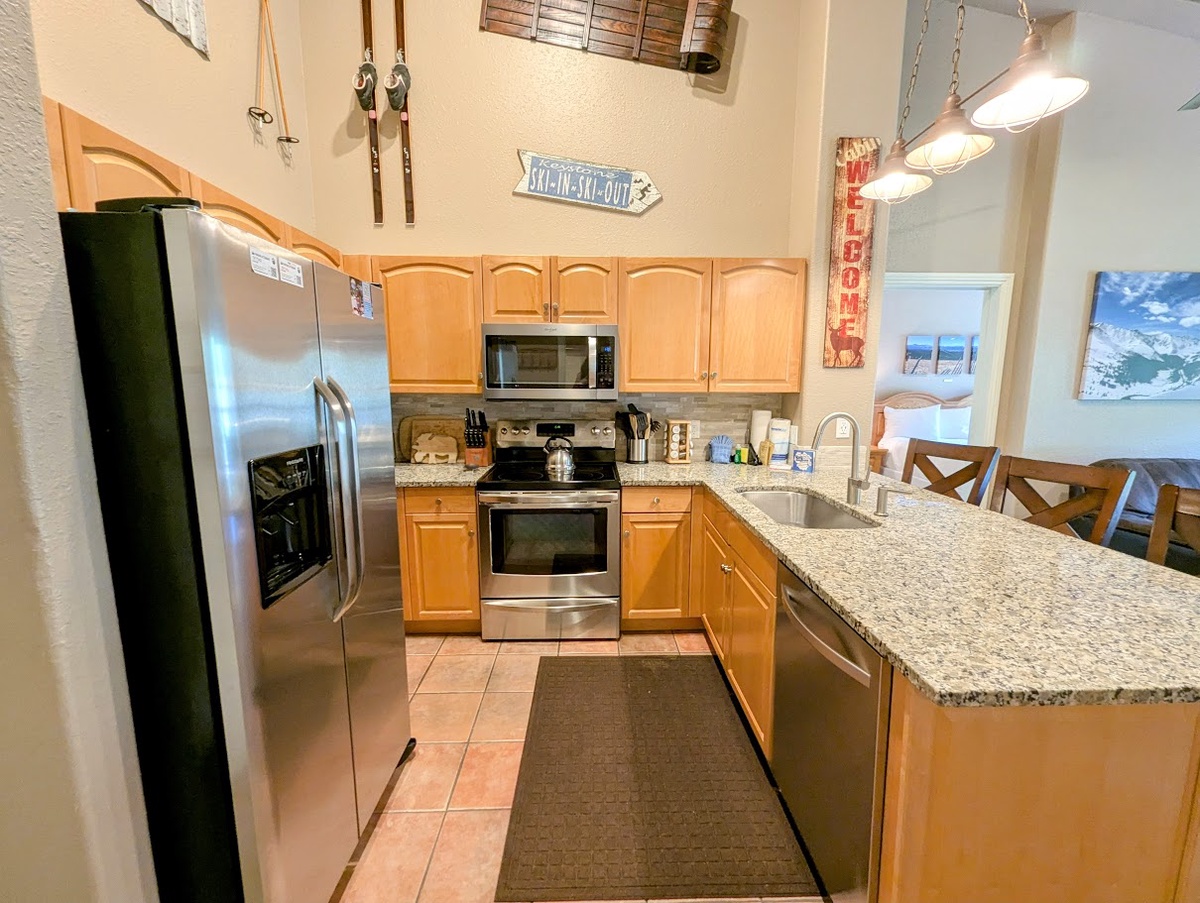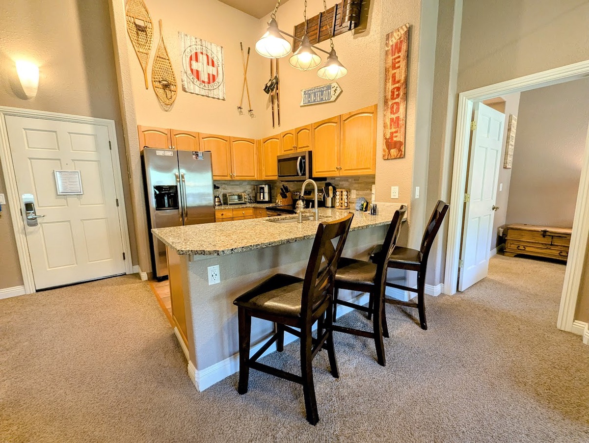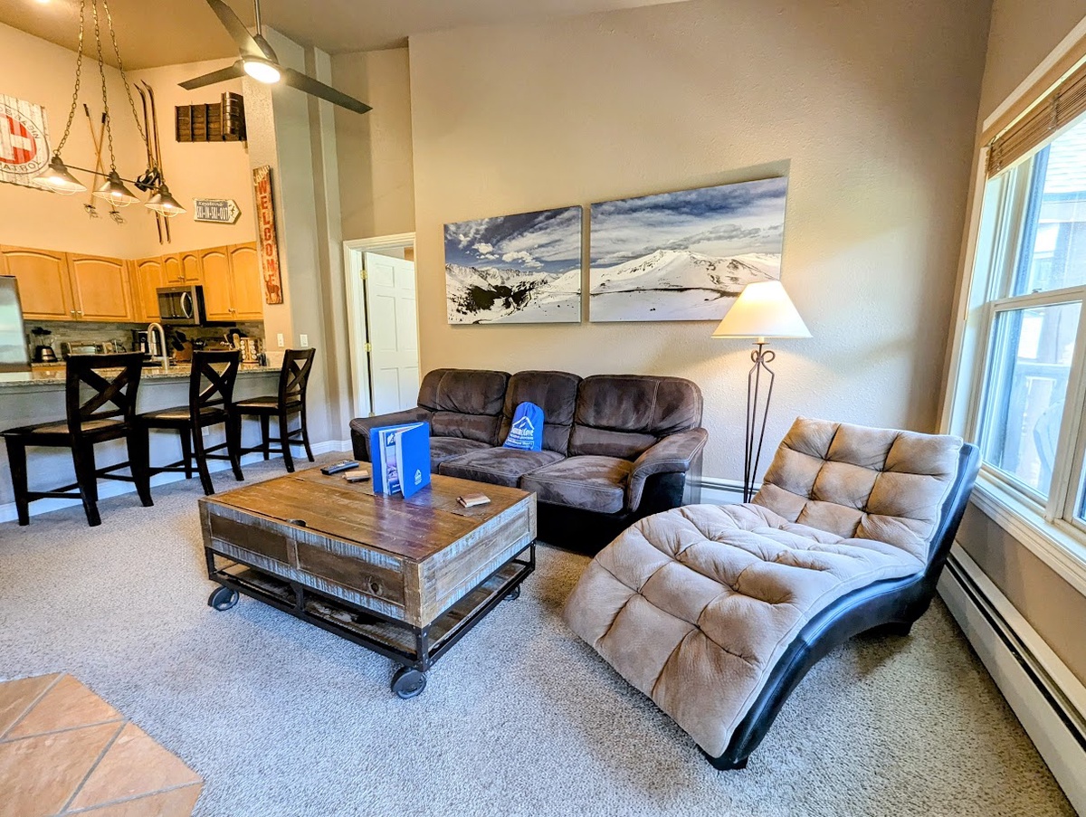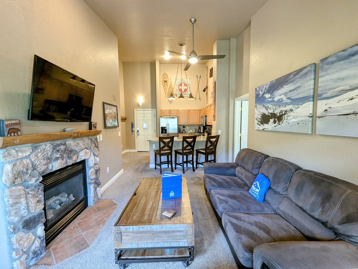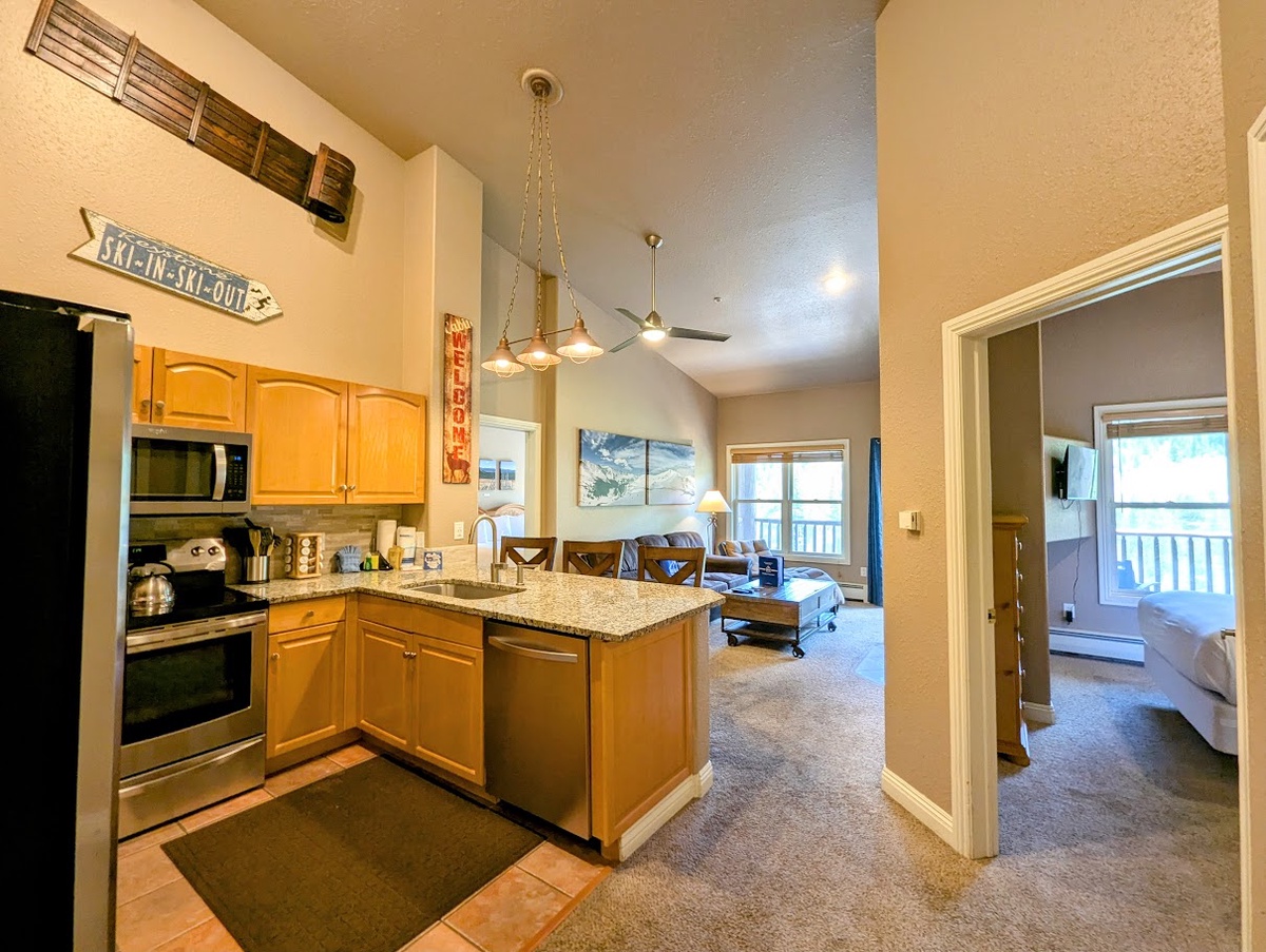 This charming mountain retreat features an open-concept living and dining area, providing ample space for relaxation and entertaining. The fully equipped kitchen boasts sleek stainless steel appliances and a modern backsplash, perfect for preparing your favorite meals. The cozy living room provides plenty of seating to accommodate your group, while there is room for three at the breakfast bar, a good place to start the day. Beautiful natural light flows through the sliding glass doors leading out to the private balcony, perfect for enjoying your morning coffee or evening cocktails while soaking in breathtaking mountain views.