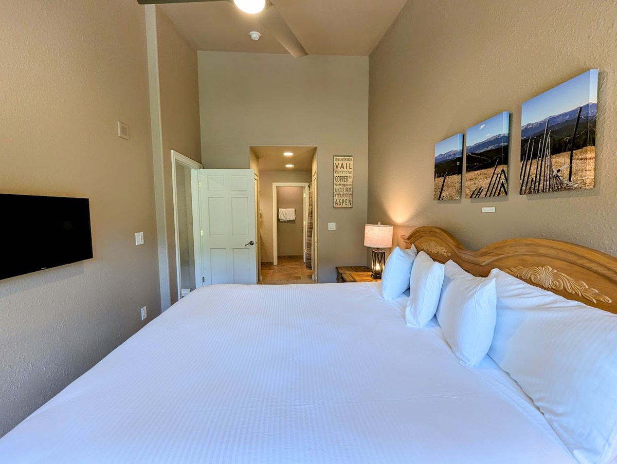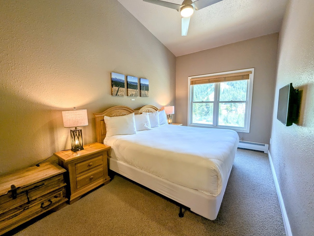 The condo comfortably sleeps six and features two stylishly appointed bedrooms and bathrooms. Soft linens and plush bedding welcome guests, ensuring a restful night’s sleep. Each room offers ample privacy and a peaceful ambiance, perfect for unwinding after a busy day exploring Keystone’s world-famous slopes. There are flat-screen TVs throughout the condo, making it easy to catch up on your favorite shows or movies as you wind down for the evening.